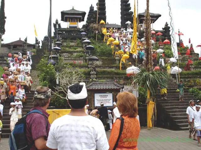The once a century Eka Dasa Rudra is the most important Hindu Festival in Indonesia. It is held when, according to the Hindu saka calendar, the year ends in two zeros. However it can also be held when natural, political or economic calamity or disturbance is such that one needs to be called. For example’s the events of the Indonesian Revolution (1945-1949). Eka Dasa Rudra is not just one festival, but a series of many. The most important is the purification sacrifice, or Taur Eka Dasa Rudra, which occurs on the last day of a saka century – saka 1900 fell, for example on 28 March 1979. During the course of the festival large numbers of animals were brought up to Besakih for sacrifice – about 60 species in all. It was not a reassuring sight for conversations, as among the creatures were tiger cubs and rare eagles. DS Fox writes a book about the festival, “Once a century: Pura Besakih and the Eka Dasa Rudra Festival (1982)”.