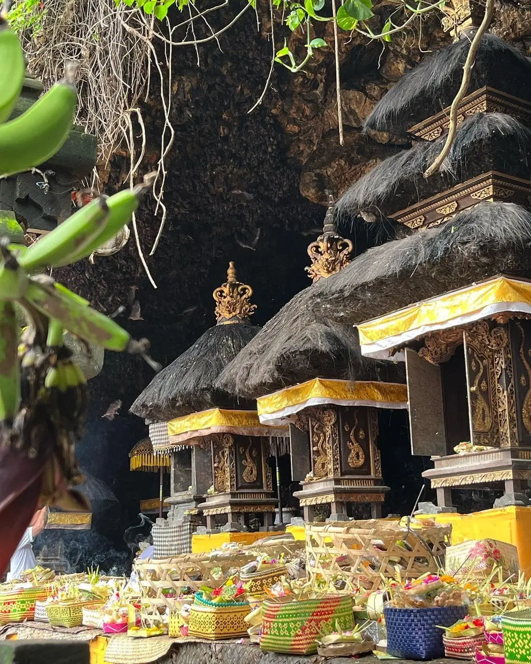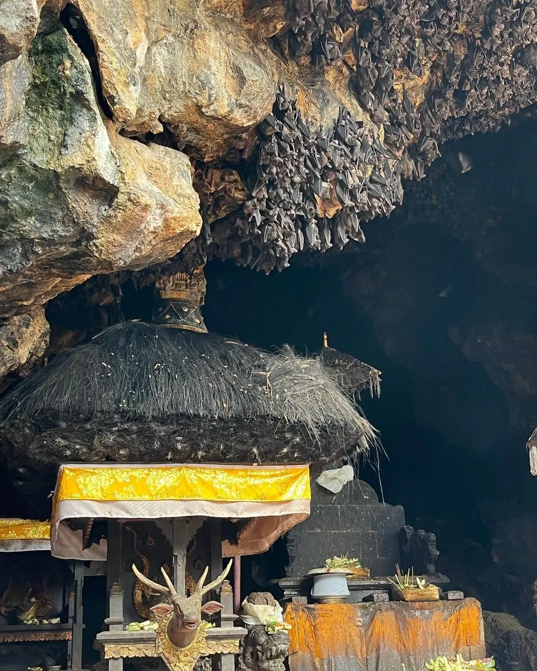 One of the most striking features of Goa Lawah is the row of shrines that line the entrance to the cave, each adorned with colorful offerings and sacred symbols. As visitors approach the cave, they are greeted by the sight and sound of thousands of bats hanging from the ceiling, their chirps and flutters adding to the mystical atmosphere.