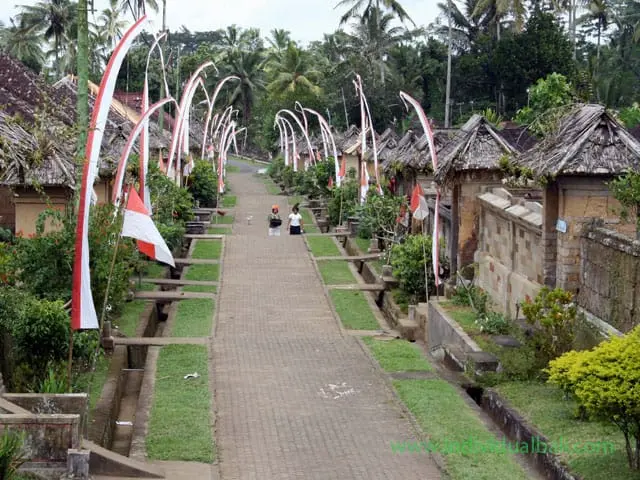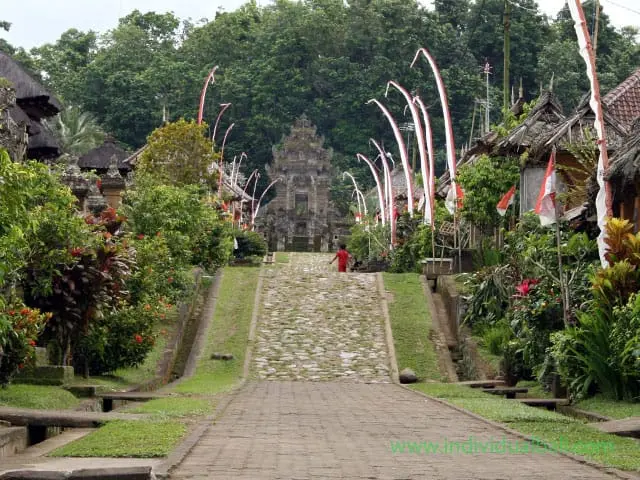 In keeping with tradition, the main road is paved with local mountain stone and provides a unique entry point to the village. The houses within the village precinct are divided into areas (east and west), and all are traditionally constructed with mud walls and bamboo roofing. The front of the house has a gate (angkul-angkul) which functions as a place of worship on holy days, and offerings will be placed here.