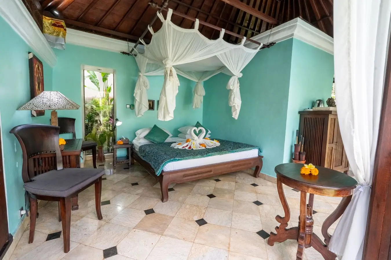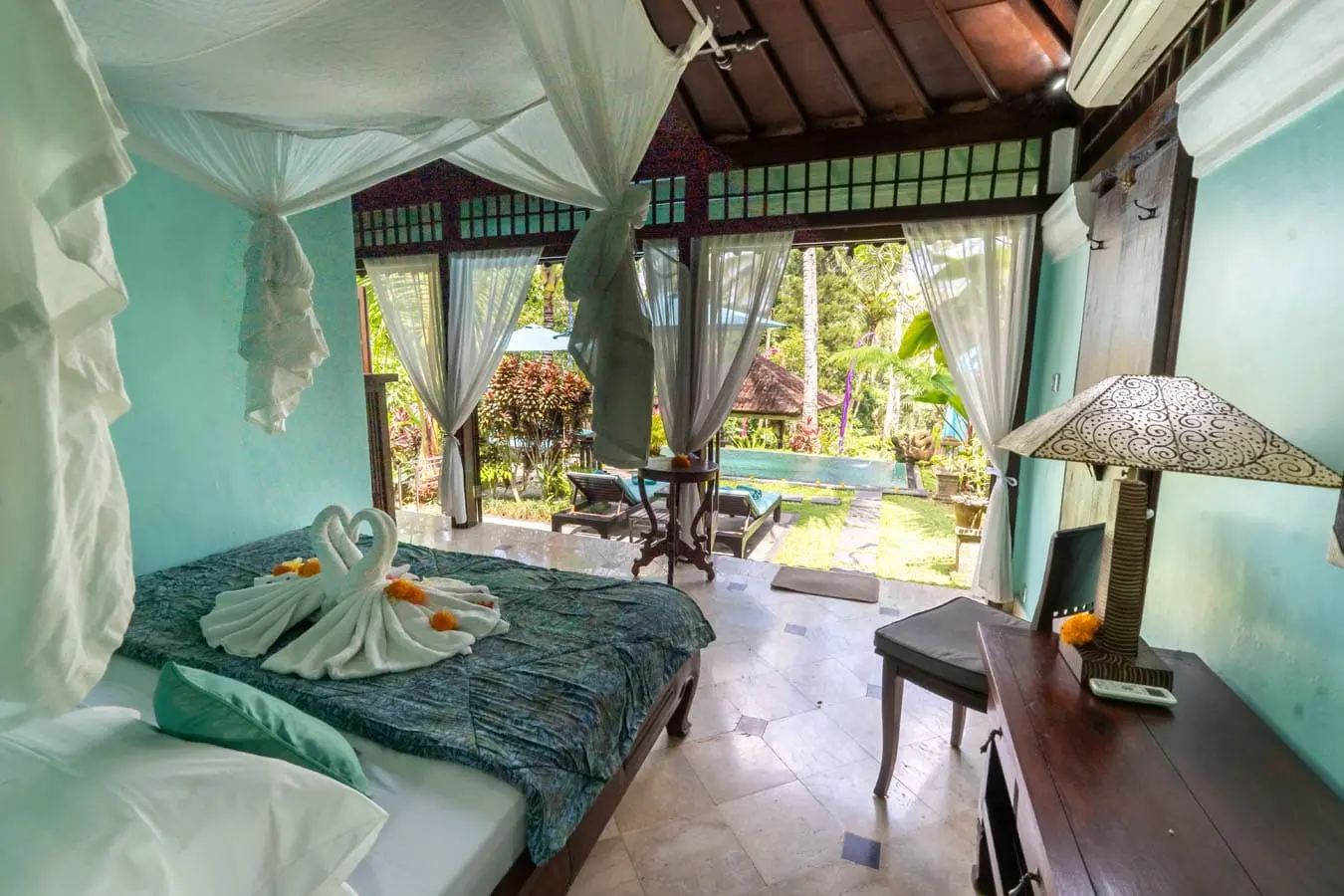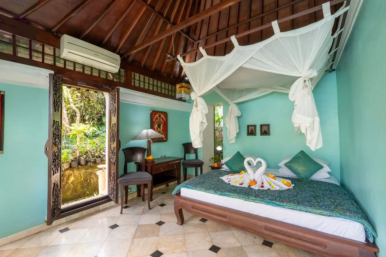 Completed with a little kitchen to prepare drinks and simple meals, the master bedroom has a living area of its own. It has also beautiful marble floor, a high traditional ceiling and a classy mahogany wooden interior design along with light blue walls, and full length glass windows and doors to enjoy the valley view for a serene ambiance. The room embraces beautiful canopied double bed, a sofa-bed where you can lounge and watch TV, a seating area for intimate breakfasts and there are relax chairs for reading a book. Master bedroom has a lovely large outdoor toilet that looks on the jungle. The en-suite bathroom features a built-in bathtub where you can hear bathe with the sounds of the river, birds and wind in the background.