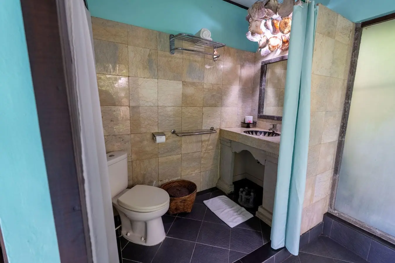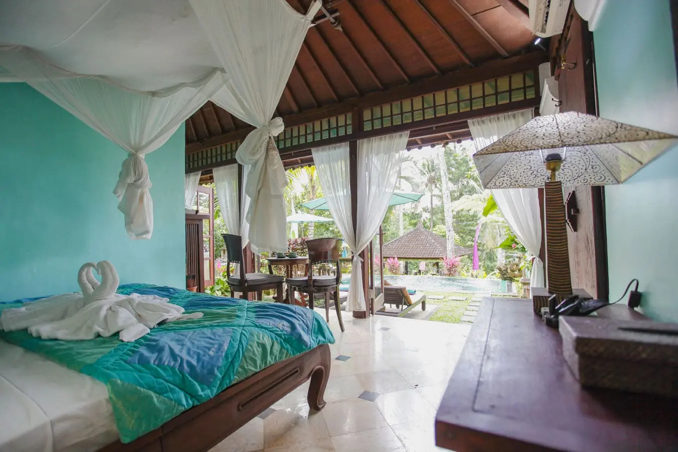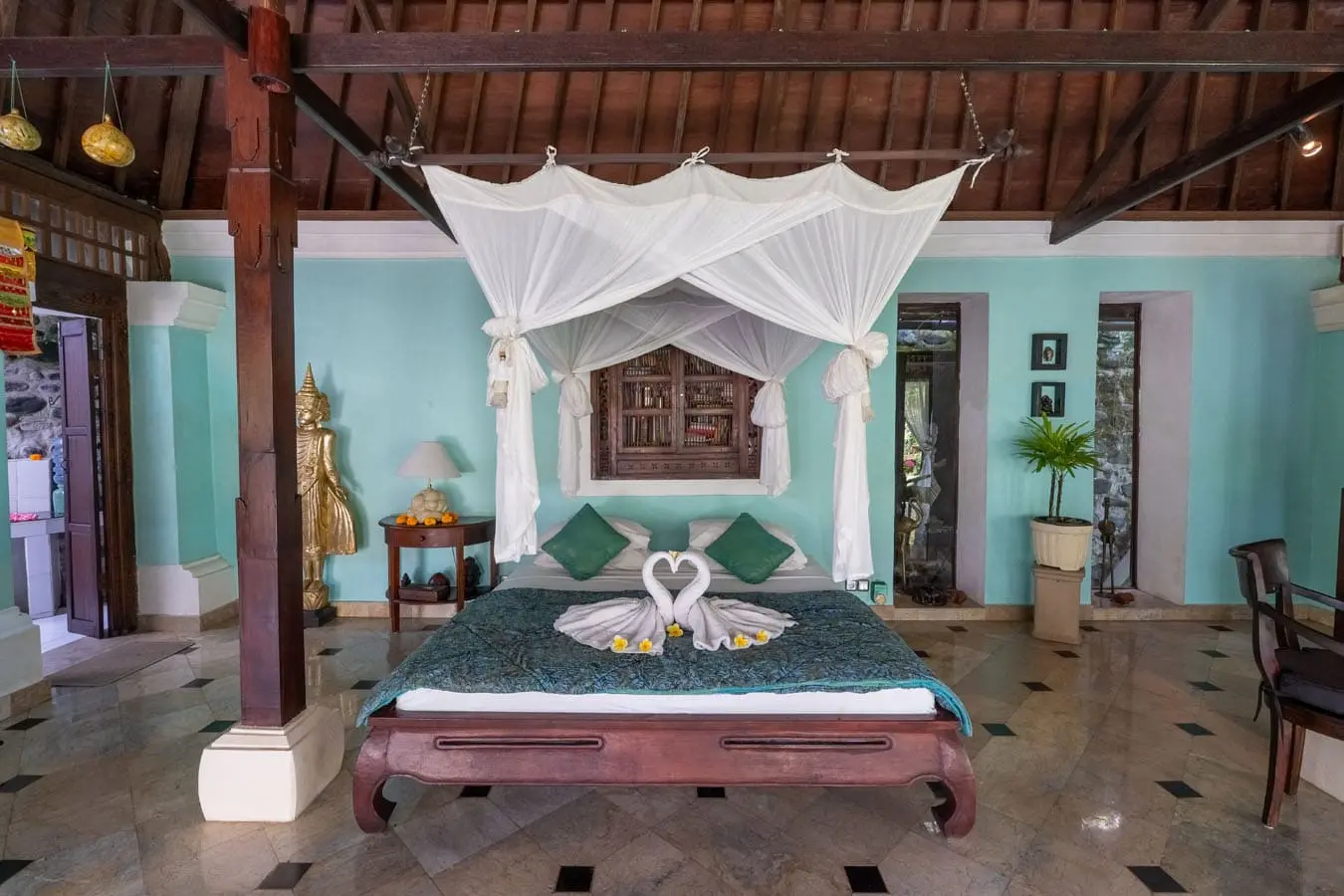Completed with a little kitchen to prepare drinks and simple meals, the master bedroom has a living area of its own. It has also beautiful marble floor, a high traditional ceiling and a classy mahogany wooden interior design along with light blue walls, and full length glass windows and doors to enjoy the valley view for a serene ambiance. The room embraces beautiful canopied double bed, a sofa-bed where you can lounge and watch TV, a seating area for intimate breakfasts and there are relax chairs for reading a book. Master bedroom has a lovely large outdoor toilet that looks on the jungle. The en-suite bathroom features a built-in bathtub where you can hear bathe with the sounds of the river, birds and wind in the background.