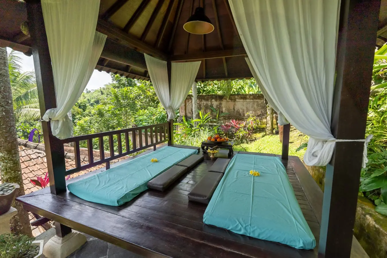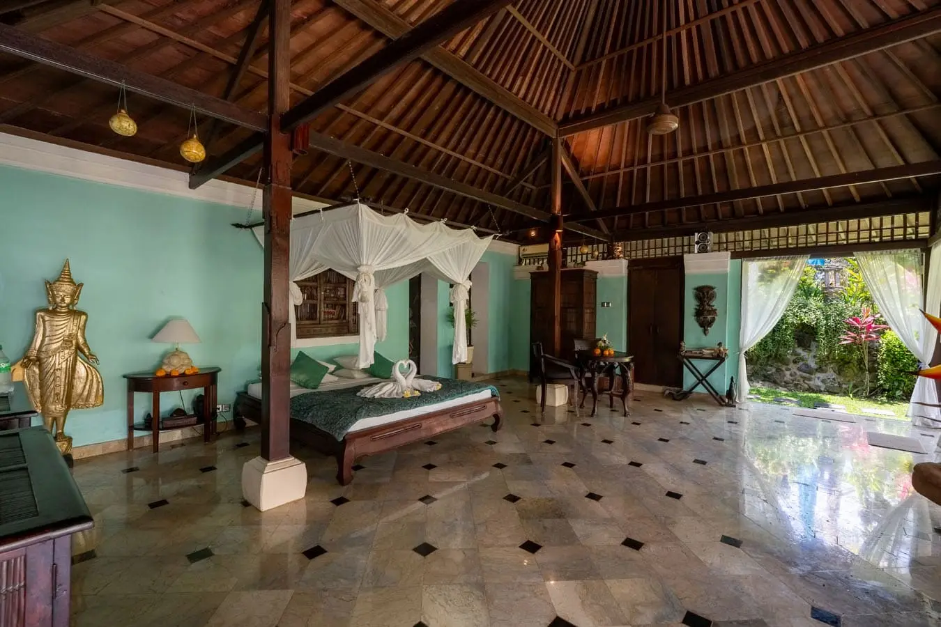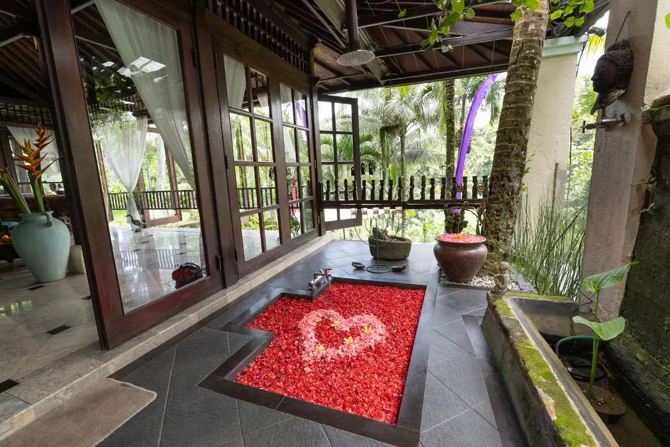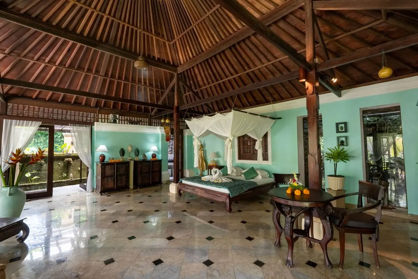 The Mahogany Villa offers a serene and tranquil retreat amidst beautiful nature, providing an ideal environment for meditation, relaxation, and healing. It is also a perfect destination for honeymooners seeking intimacy and romance. Nestled in the traditional Balinese village of Sumita, the villa provides guests with an authentic Balinese experience, surrounded by natural landscapes and immersed in the rural life of farmers and daily Balinese ceremonies at temples.