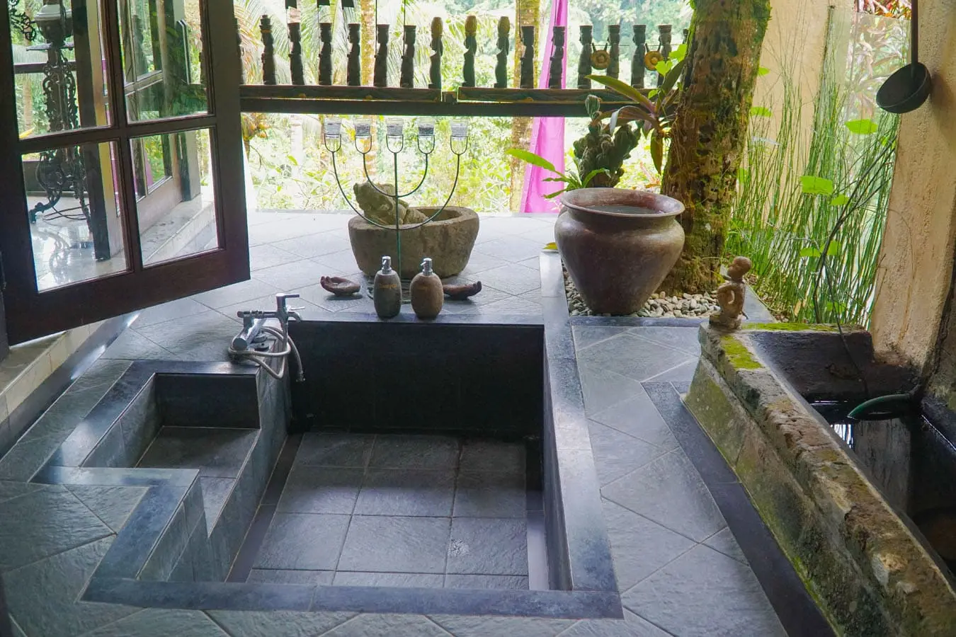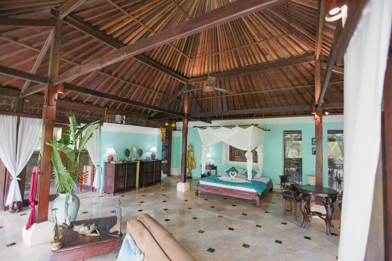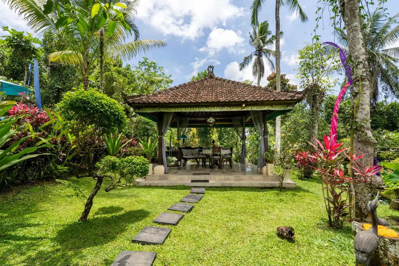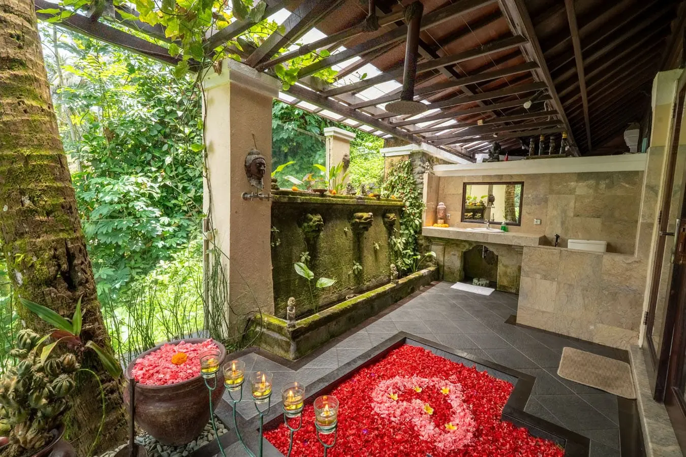The Mahogany Villa offers a serene and tranquil retreat amidst beautiful nature, providing an ideal environment for meditation, relaxation, and healing. It is also a perfect destination for honeymooners seeking intimacy and romance. Nestled in the traditional Balinese village of Sumita, the villa provides guests with an authentic Balinese experience, surrounded by natural landscapes and immersed in the rural life of farmers and daily Balinese ceremonies at temples.