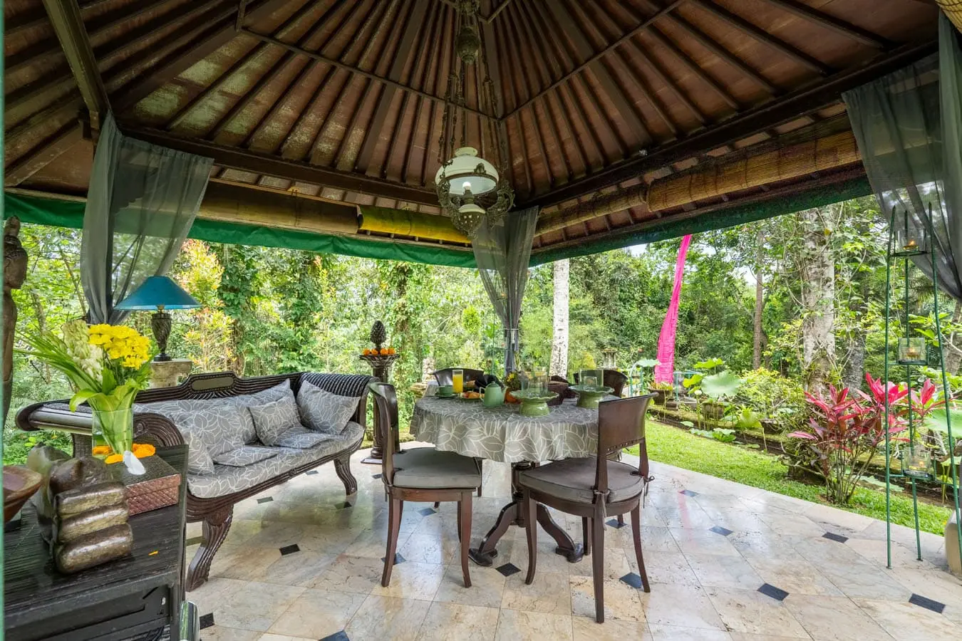 Instead of living room we provide “Bale Bengong” as a place to relax and enjoy the serenity in the middle of green atmosphere and wide tropical valley view. Blended in with the extraordinary natural environment, the living area is found in a Balinese Balé Bengong (gazebo). It is a rectangular gazebo with an open air style, purple curtains, beautiful antique sofa’s and a circular wooden table with chairs. The place to come if you want to meditate, yoga, writes or read a book, perfect for romantic alfresco dinning with candles burning and the right music playing. The atmosphere on this lovely designed living area and garden around it is truly unique to experience.