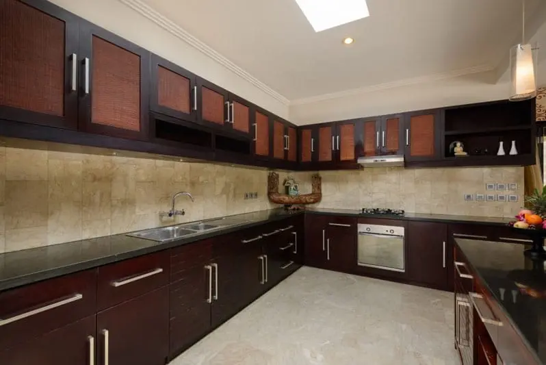 The villa’s living and dining areas boast high ceilings with louver windows above bi-fold doors, allowing for excellent air-flow and natural light. The space is adorned with custom-designed furnishings, stunning marble floors, LED lighting, and a surround sound music system. The dining room comfortably seats 8 guests and is adjacent to a fully equipped kitchen with dark granite benchtops and modern appliances. The living area features a wide-screen LCD TV, DVD/CD player with a surround sound system, and an iPod docking station.