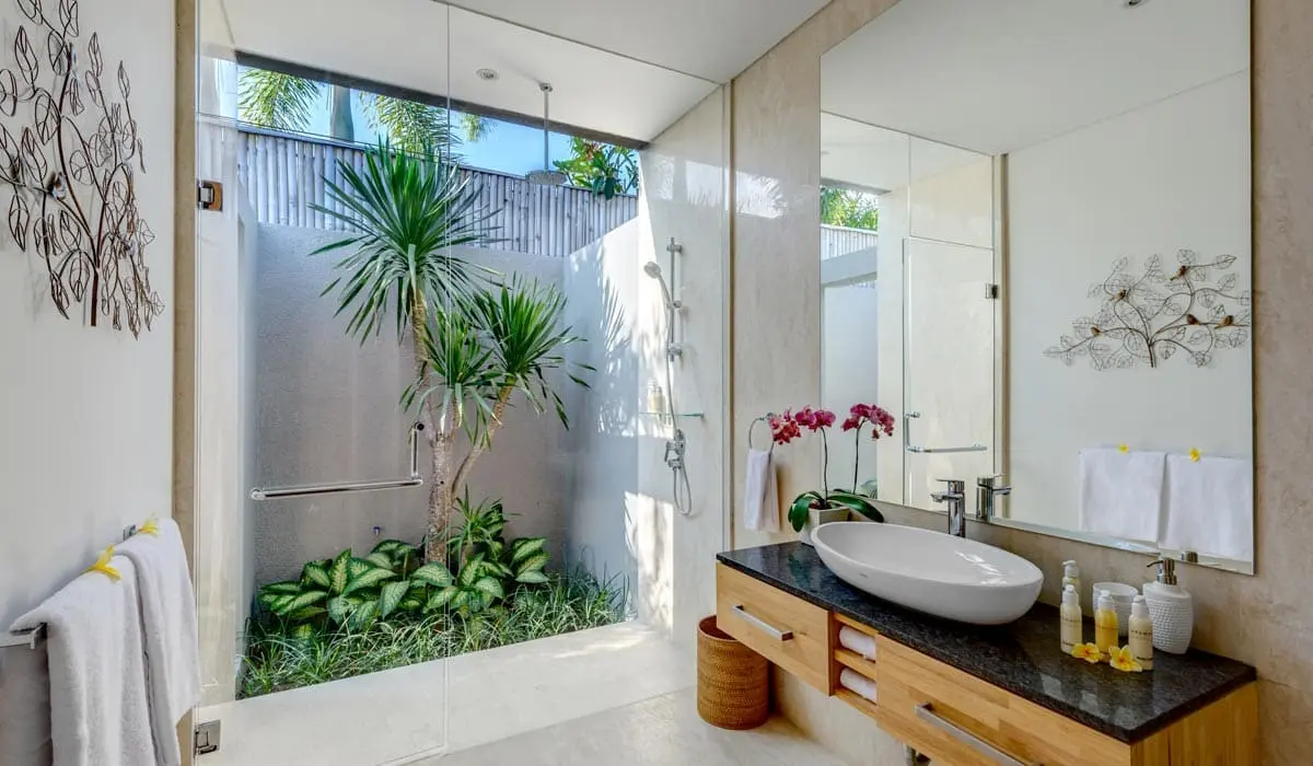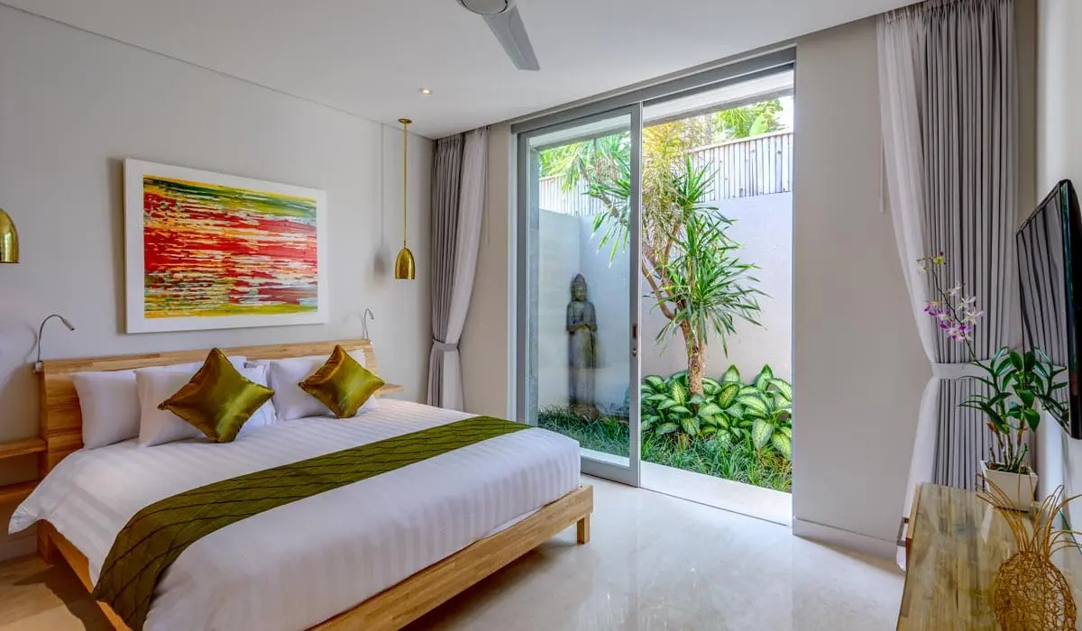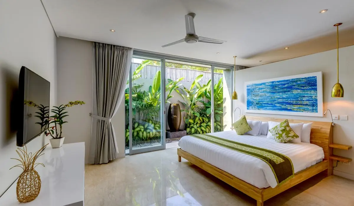 The villa offers four bedrooms, comfortably accommodating up to 8 guests. The master bedroom features a large suite with a walk-through wardrobe, a large makeup station, and an ensuite bathroom with a deep free-standing soaking tub overlooking a private garden. All bedrooms are elegantly designed, with views of the private tropical garden walls, flat-screen TVs, air-conditioning, and ensuite bathrooms with outdoor rainforest-style showers. One of the bedrooms is located in a free-standing building, offering uninterrupted views of the shimmering pool.