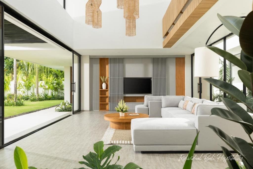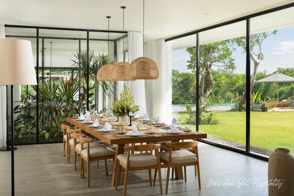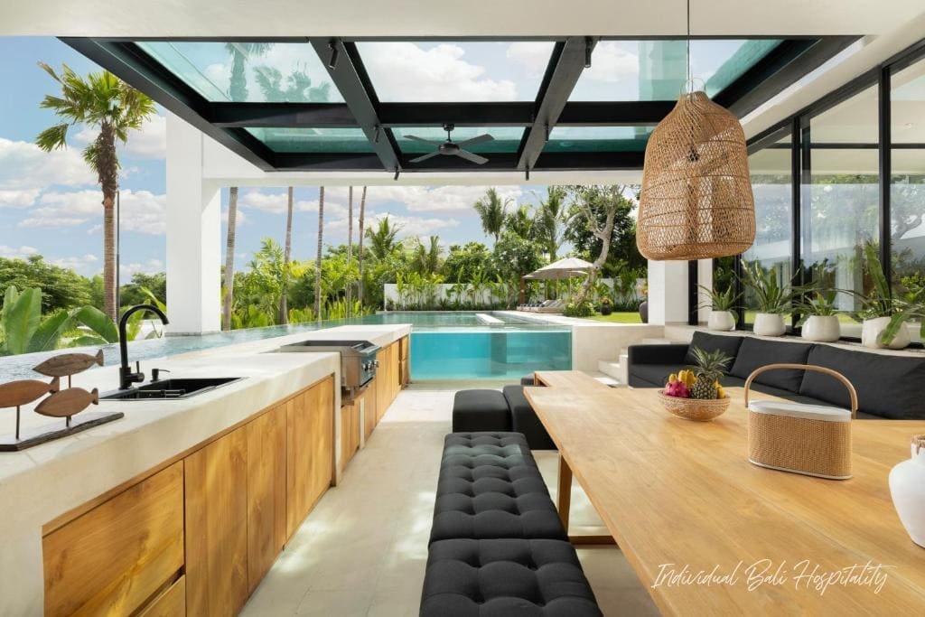 Outdoors, Arita Villa reveals its oasis: a large swimming pool, poolside lounge, and landscaped gardens designed for both relaxation and social moments. Whether enjoying a morning yoga session, sunbathing with a book, or sharing evening cocktails by the pool, the villa’s outdoor spaces embrace tranquility and rejuvenation.