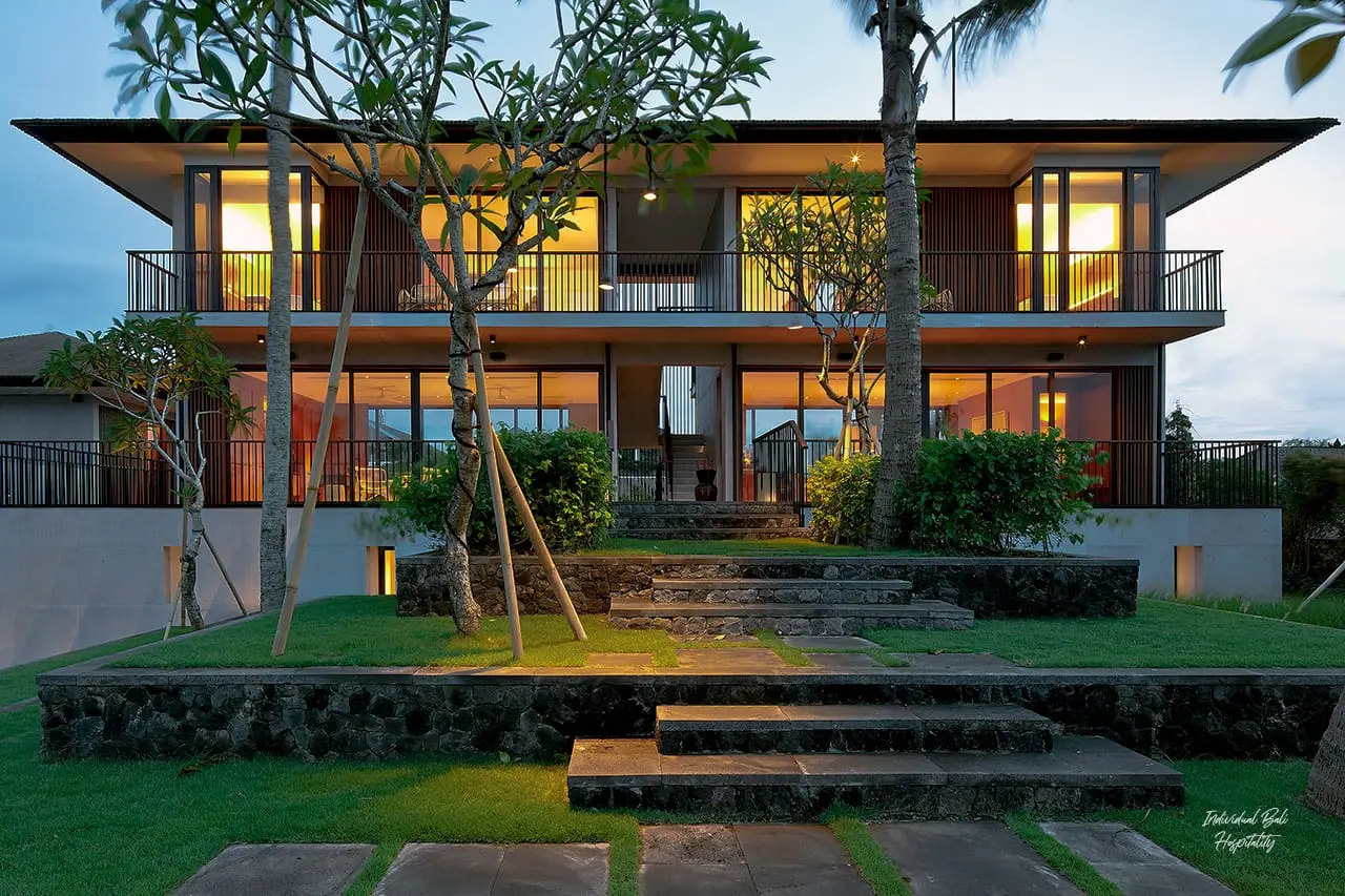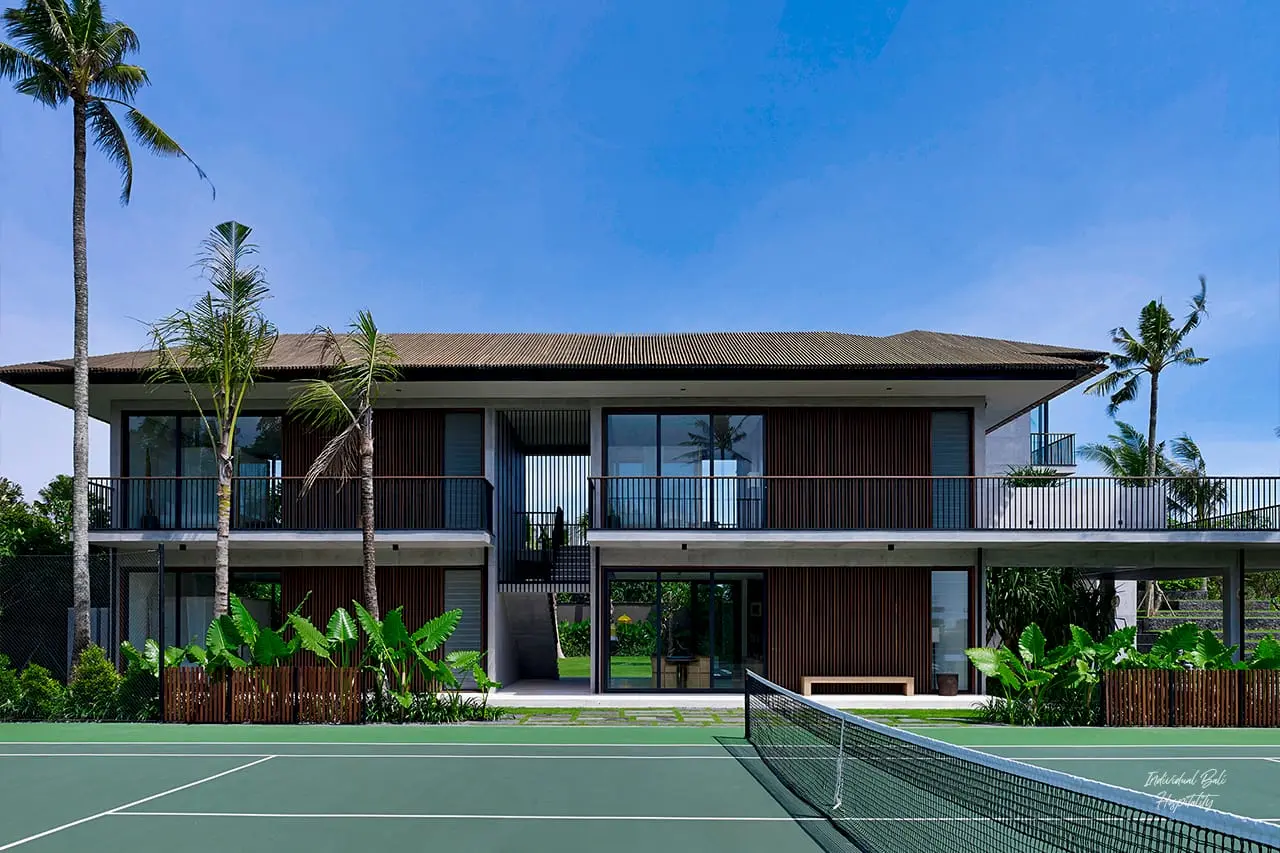 The villa features expansive floor-to-ceiling windows framing uninterrupted ocean views from the upper-floor master suites. Active guests will appreciate the private tennis court, 20-metre saltwater pool, fully equipped gym, spa room, and yoga platforms overlooking breathtaking sunrises and nearby sacred temple rituals.