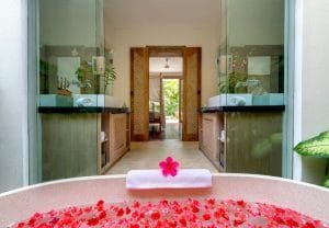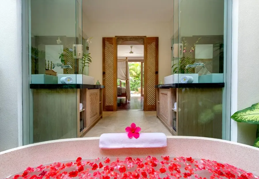 The villa features four spacious air-conditioned bedrooms, all with ocean views and en-suite bathrooms with showers and bathtubs. Guests have ample wardrobe space and safety deposit boxes for their convenience. The bedrooms are furnished with fabulous super king beds (200x200cm) of the highest quality, complete with mosquito nets. Two bedrooms are located on each floor for added privacy.