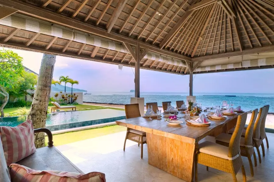 The Bale, a charming Balinese outdoor dining room, is a favorite among guests. It is beautifully situated facing the swimming pool and the ocean, offering the perfect setting for meals. Guests are protected from the sun with a pleasant sea breeze and can enjoy the spectacular view.