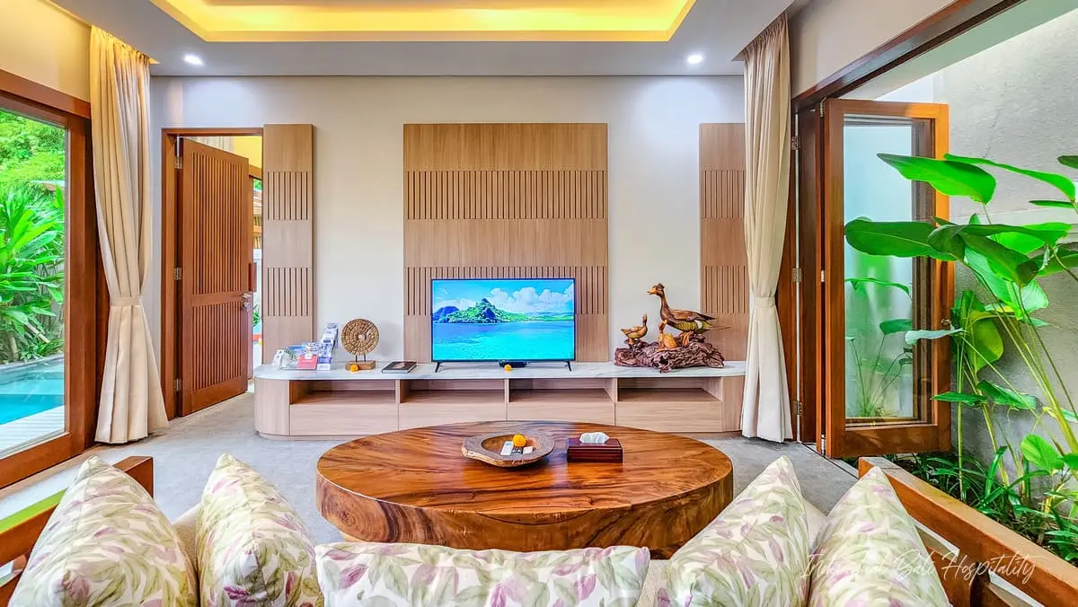 The villa’s open-plan living area is thoughtfully designed to create a seamless flow between indoor and outdoor spaces. Large glass doors open up to the private swimming pool, inviting natural light and tropical breezes into the home. The fully equipped kitchen is a culinary haven, complete with modern appliances and ample space for preparing delightful meals.