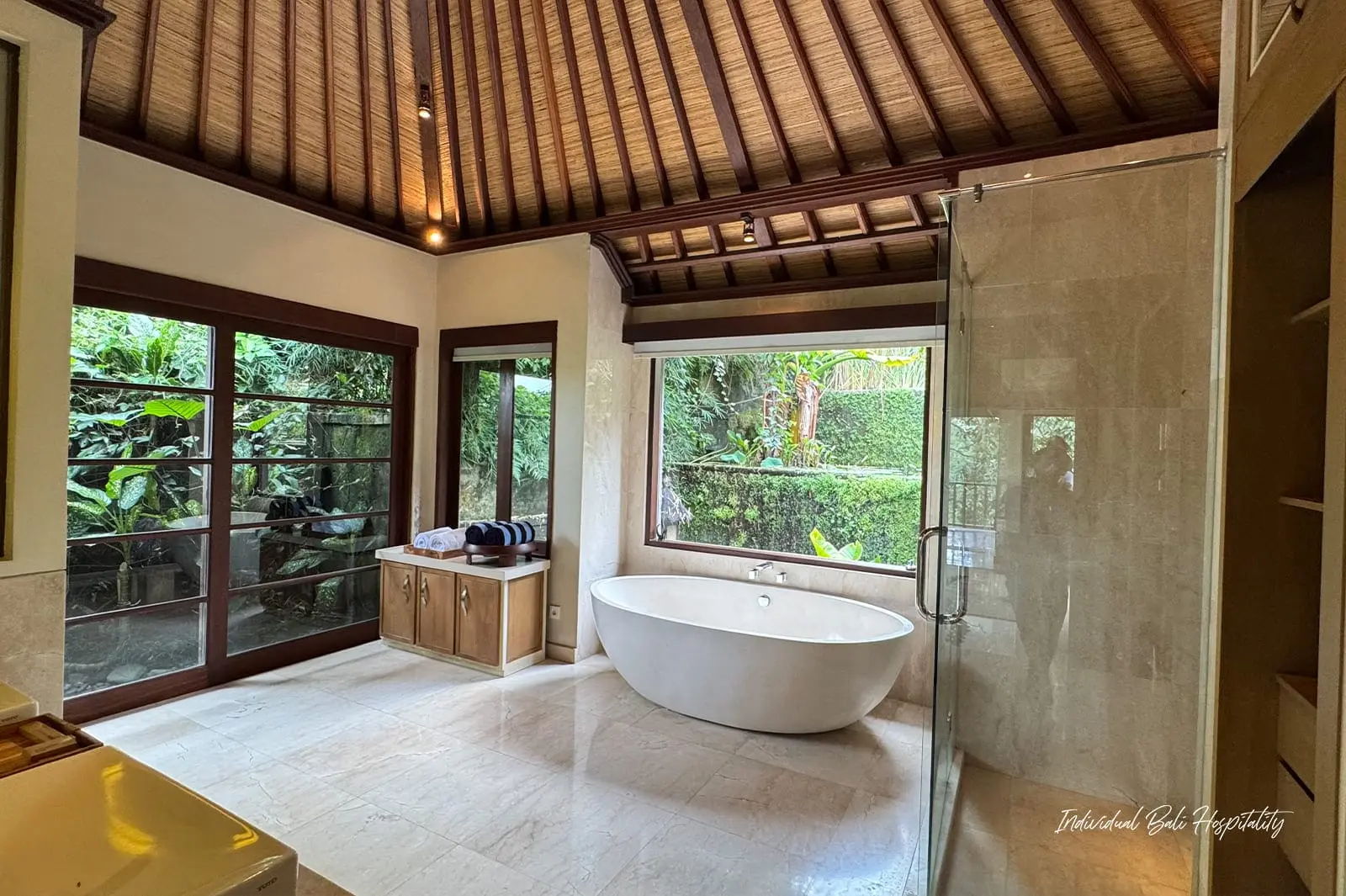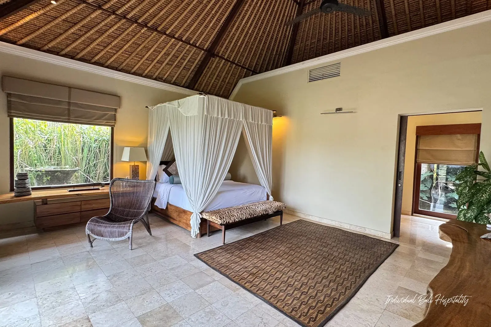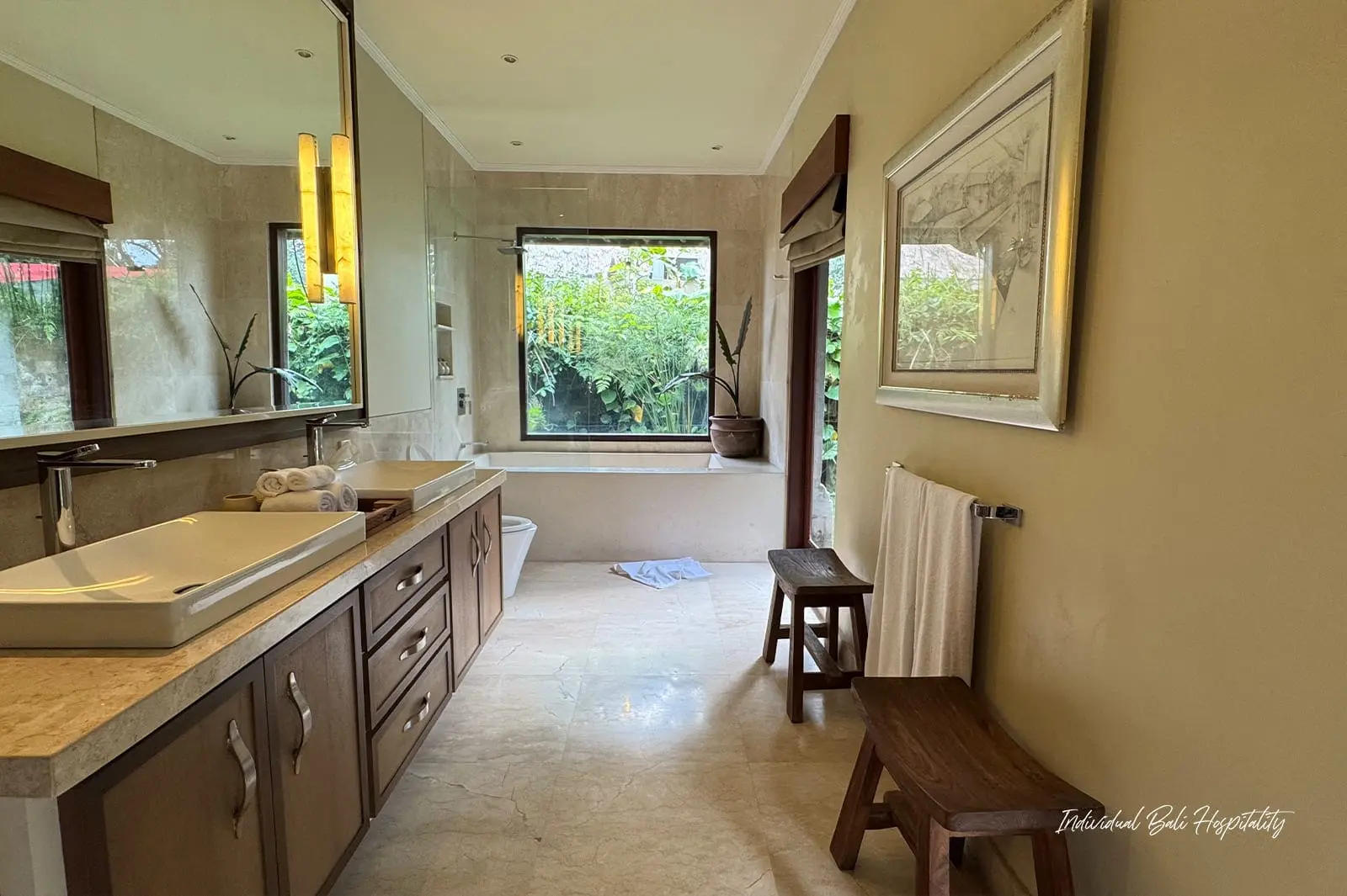Each of the villa’s three spacious bedrooms is beautifully designed with natural materials and rich wood tones, featuring its own luxurious en-suite bathroom. The open-plan design seamlessly connects the interiors with the tranquil outdoors, allowing guests to fully immerse themselves in Ubud’s natural beauty.