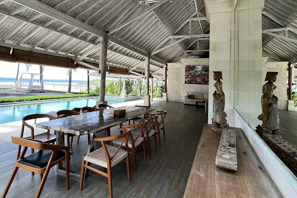 The large, lofty living room features stunning ocean views, with a high-vaulted ceiling allowing fresh air to circulate. The interior design is tropical chic, with bamboo lamps, rattan sofas, and statues creating a charming atmosphere. There are comfortable sitting areas and a large wooden dining table with rattan chairs, perfect for dining alfresco on the terrace under a sunburst or starlit sky.