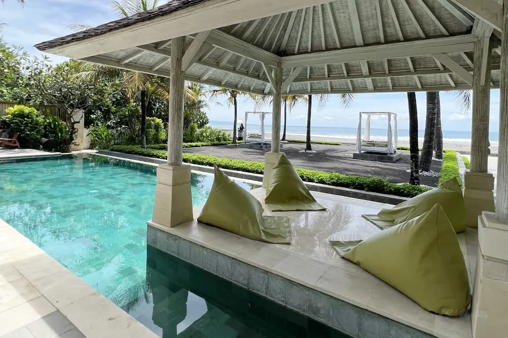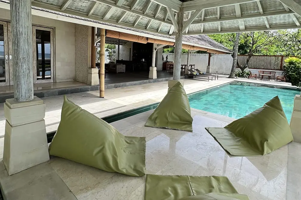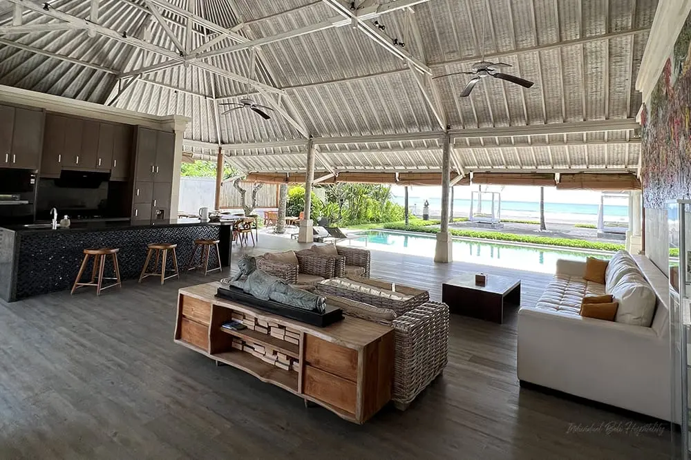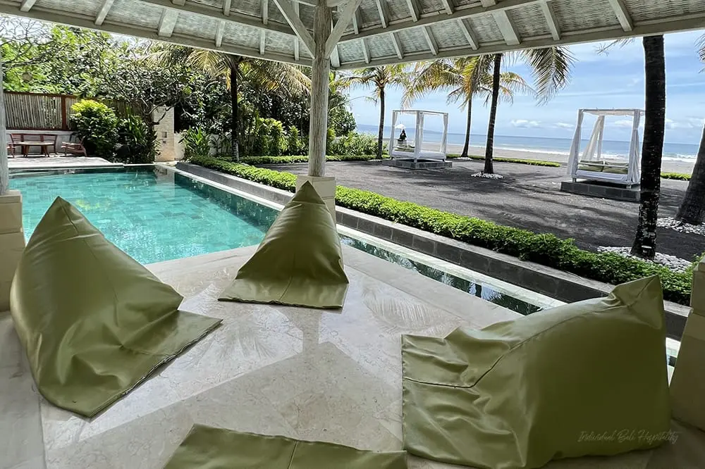 The outdoor area is expansive, with manicured lawns ideal for parties, BBQ feasts, or kids’ play. Although there is no direct beach access, the ocean views from everywhere are enchanting. The villa boasts a sparkling turquoise pool for swimming or water fun, along with poolside lounge beds for relaxation or sunbathing. The bales (gazebos) offer cozy spots to chill out on bean bags, sipping cocktails and enjoying the tropical surroundings.