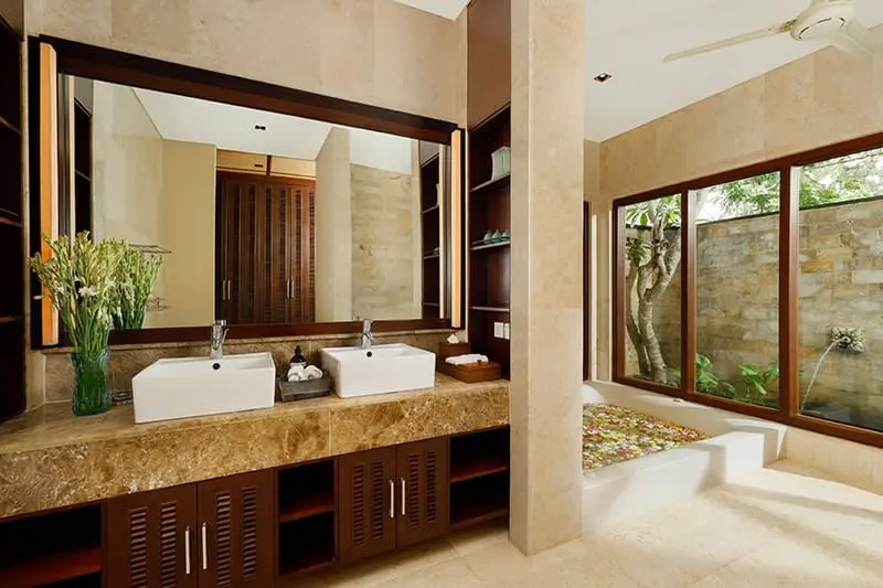 - Master bedroom features a spa-like bathroom with a private bathtub and his-and-her sinks.