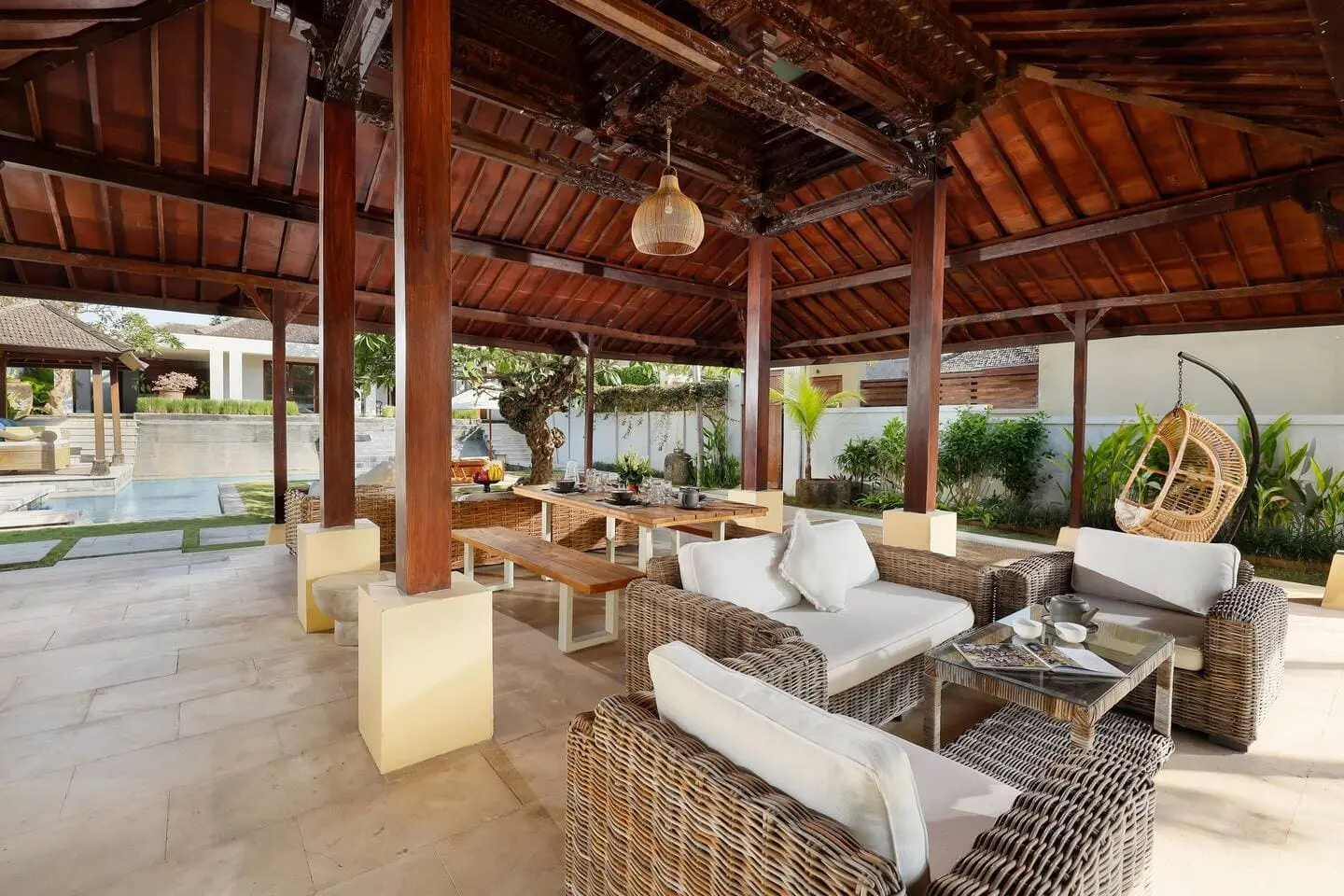 In the five-bedroom villa, the living room is spacious and grand, making it an ideal gathering place for larger groups. Whether you’re celebrating a special occasion or just enjoying quality time together, this living room provides the perfect setting. The elegant wooden doors and intricate Balinese carvings add to the overall charm of the space. Both living rooms are equipped with modern amenities, including Smart TVs, allowing you to enjoy entertainment at your leisure. It’s where you can truly relax and relish the moments that matter.