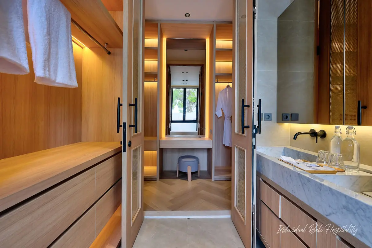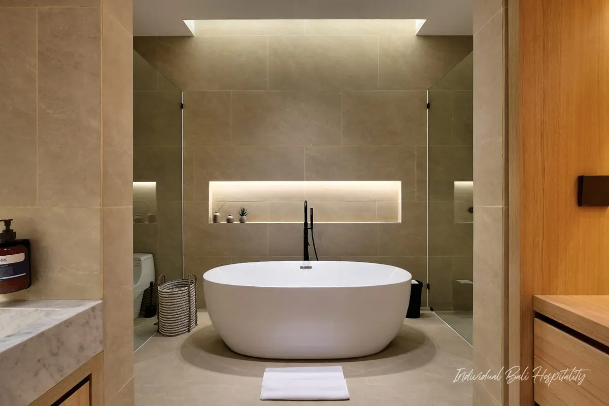 Each bedroom is equipped with air-conditioning, Smart TV, wardrobe, and en-suite bathroom. Selected rooms include bathtubs and double sinks for added comfort.
