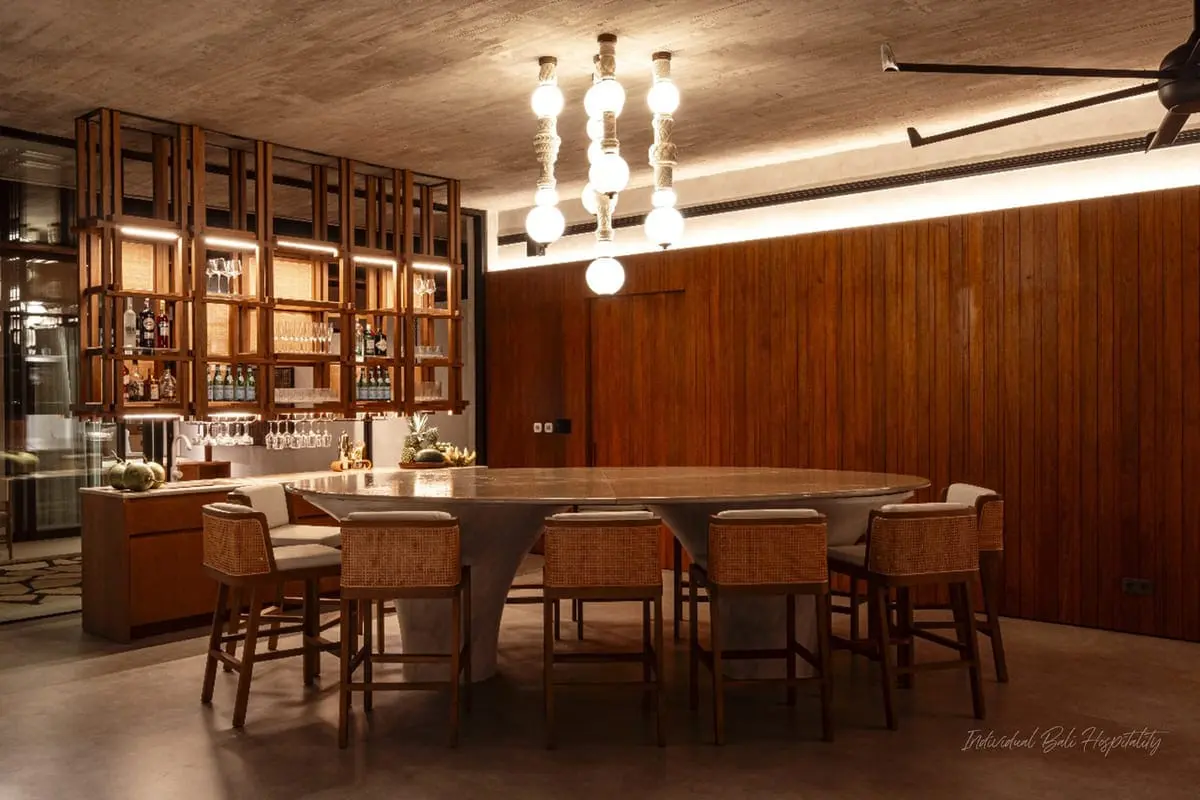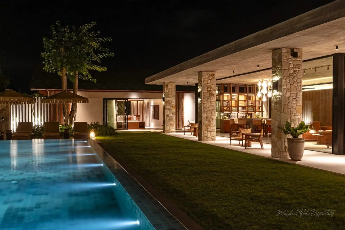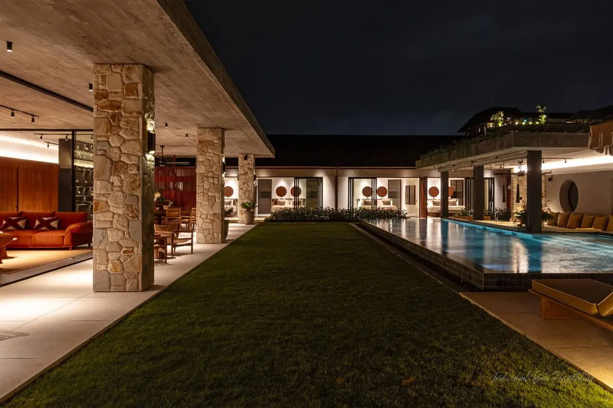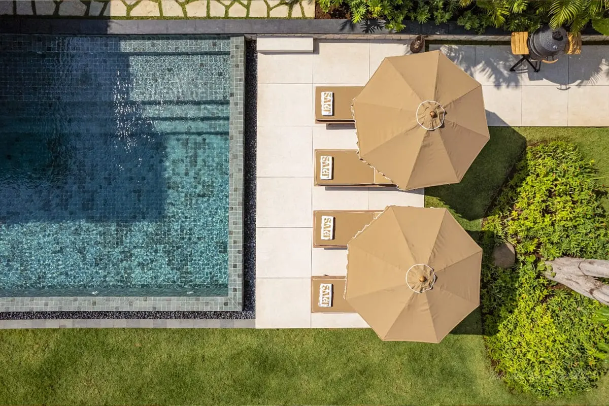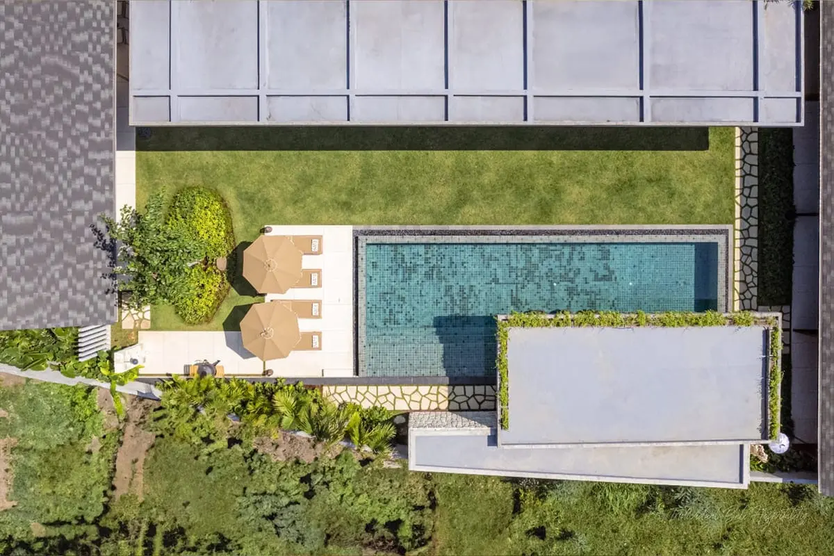 At the heart of the villa is its stunning 15 x 6 m pool, complete with a swim-up bar and a chic Pool Pavilion, perfect for enjoying the tropical ambiance. A spacious lawn unfolds alongside, providing the ideal setting for morning yoga, family gatherings, or private celebrations.