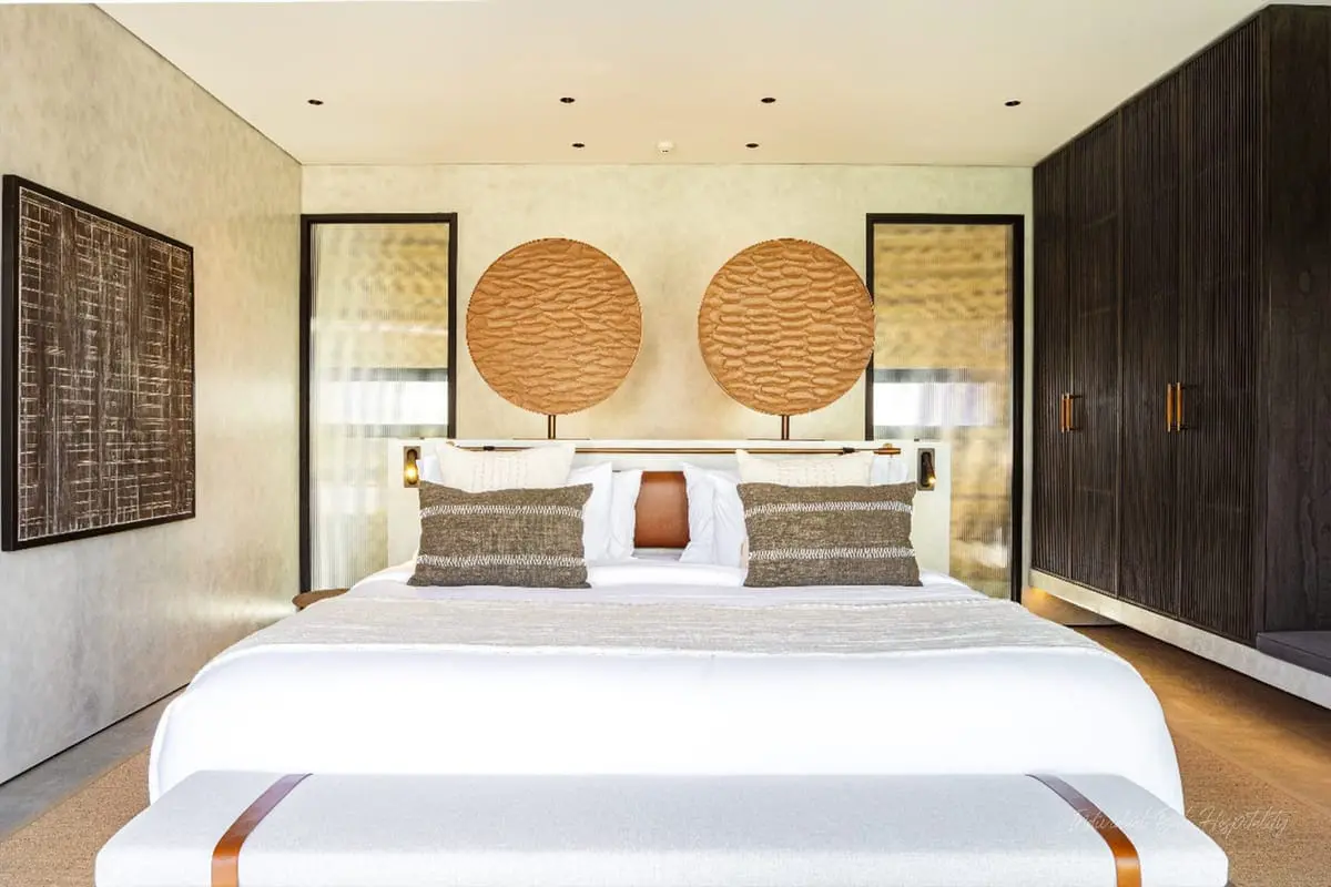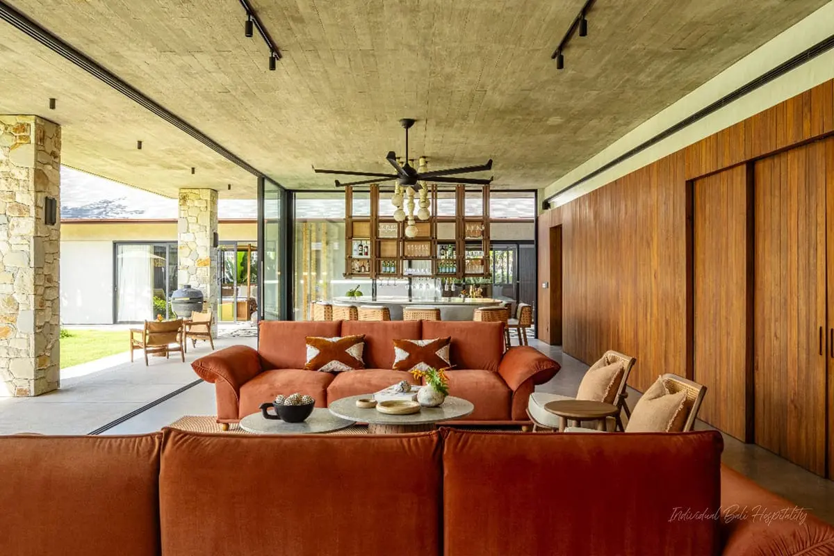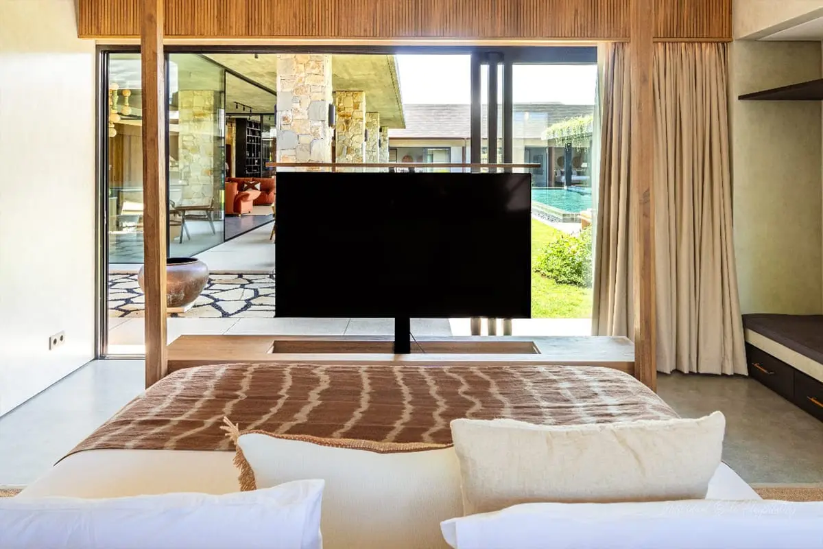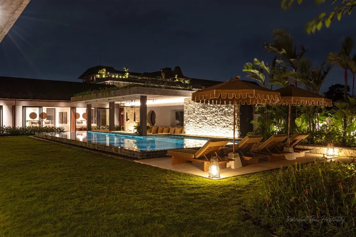 At the heart of the villa is its stunning 15 x 6 m pool, complete with a swim-up bar and a chic Pool Pavilion, perfect for enjoying the tropical ambiance. A spacious lawn unfolds alongside, providing the ideal setting for morning yoga, family gatherings, or private celebrations.