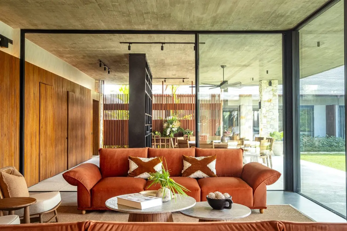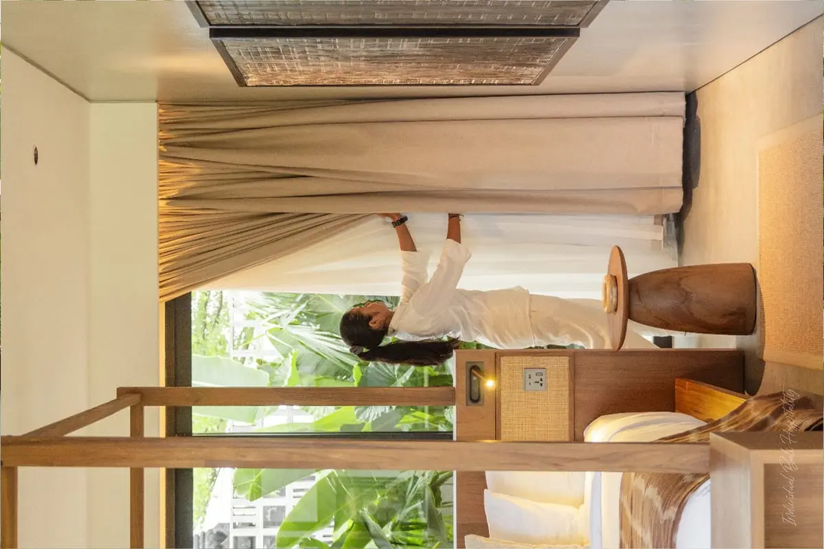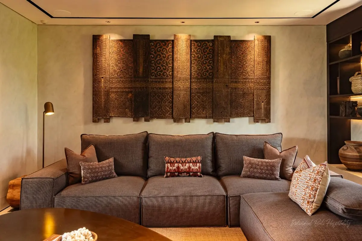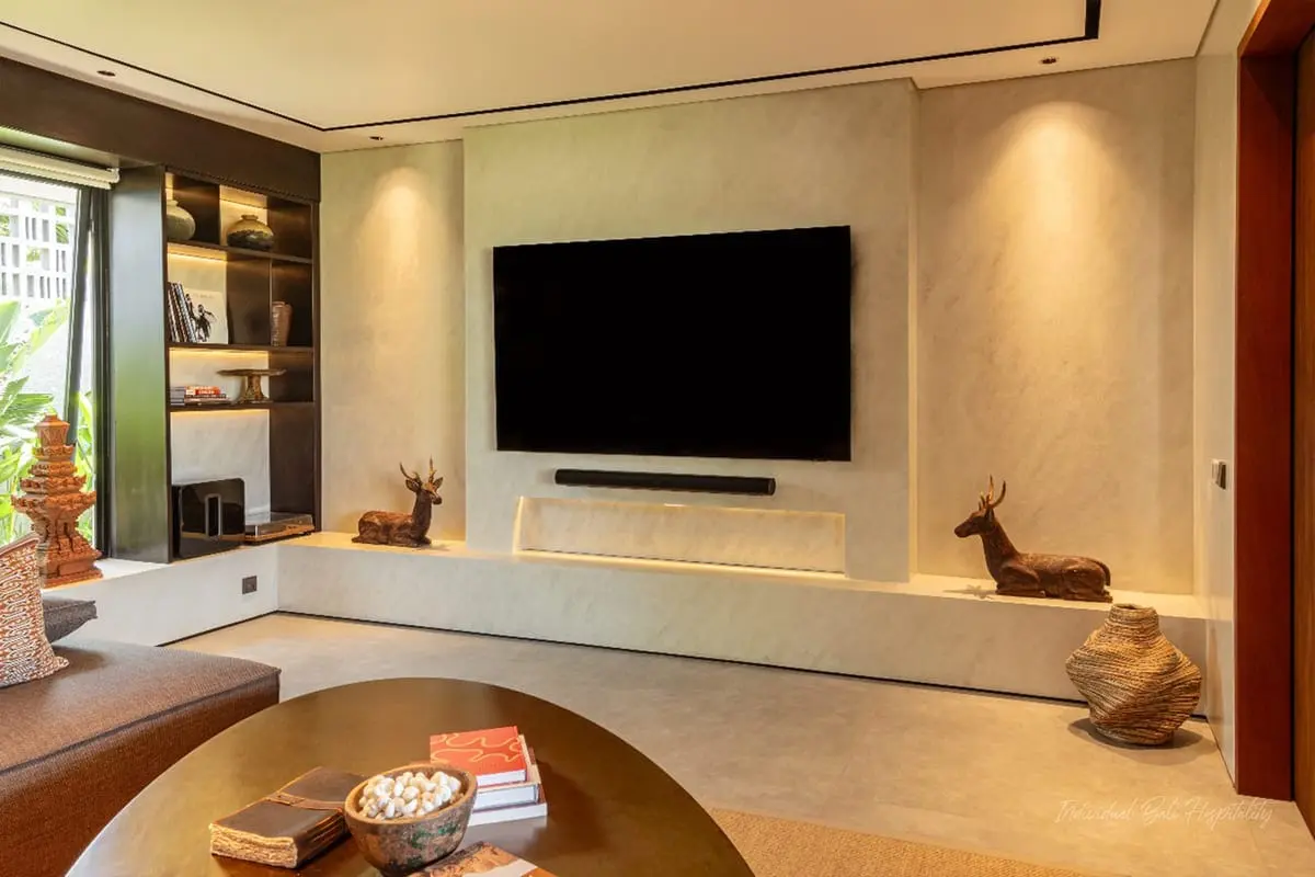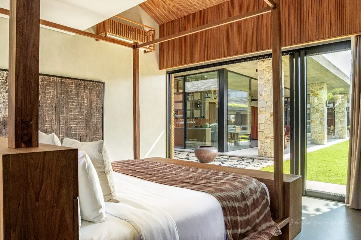 At the heart of the villa is its stunning 15 x 6 m pool, complete with a swim-up bar and a chic Pool Pavilion, perfect for enjoying the tropical ambiance. A spacious lawn unfolds alongside, providing the ideal setting for morning yoga, family gatherings, or private celebrations.