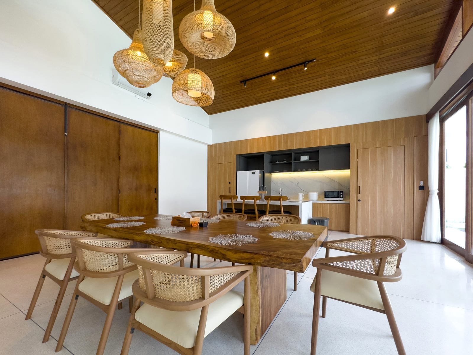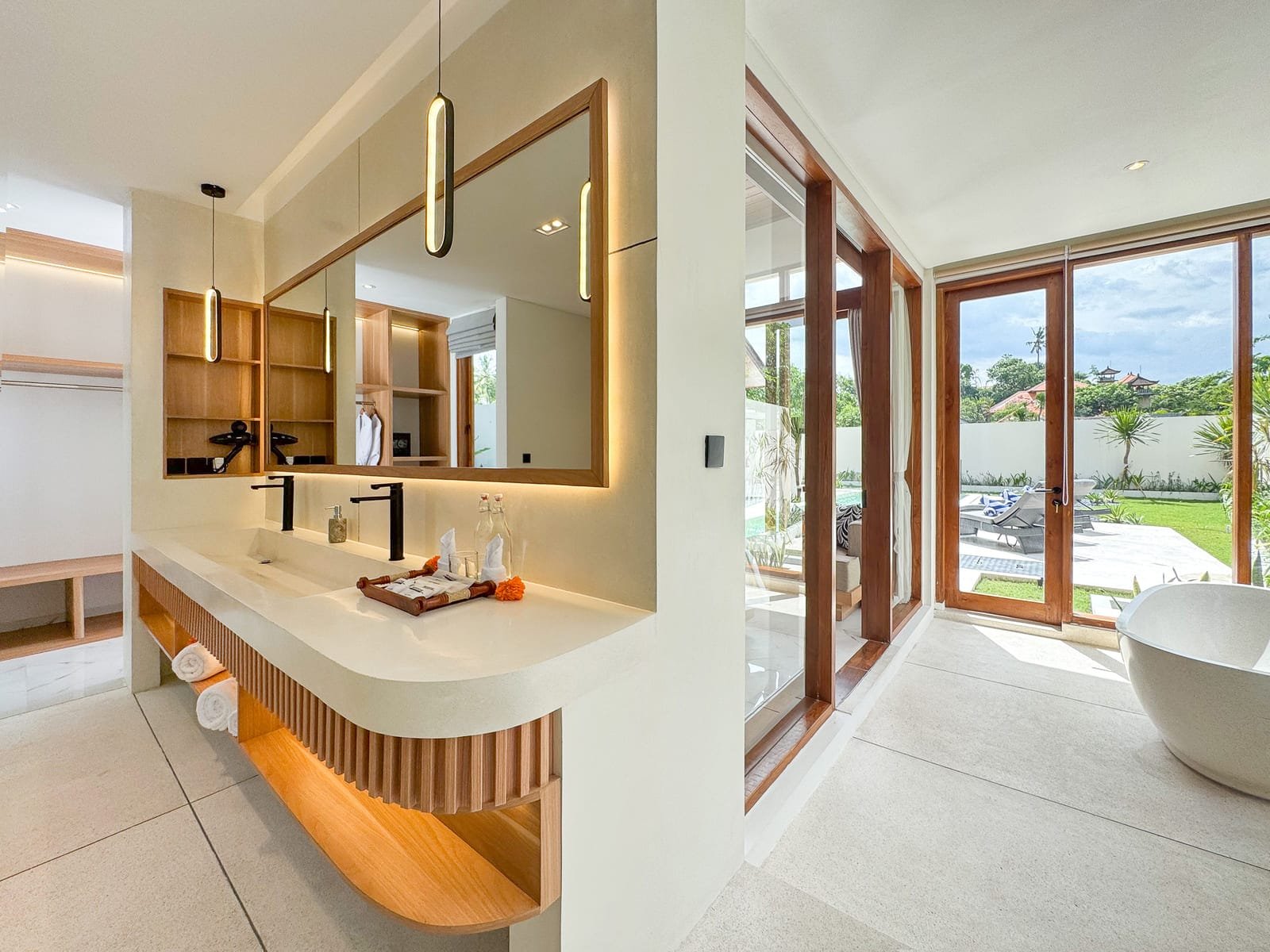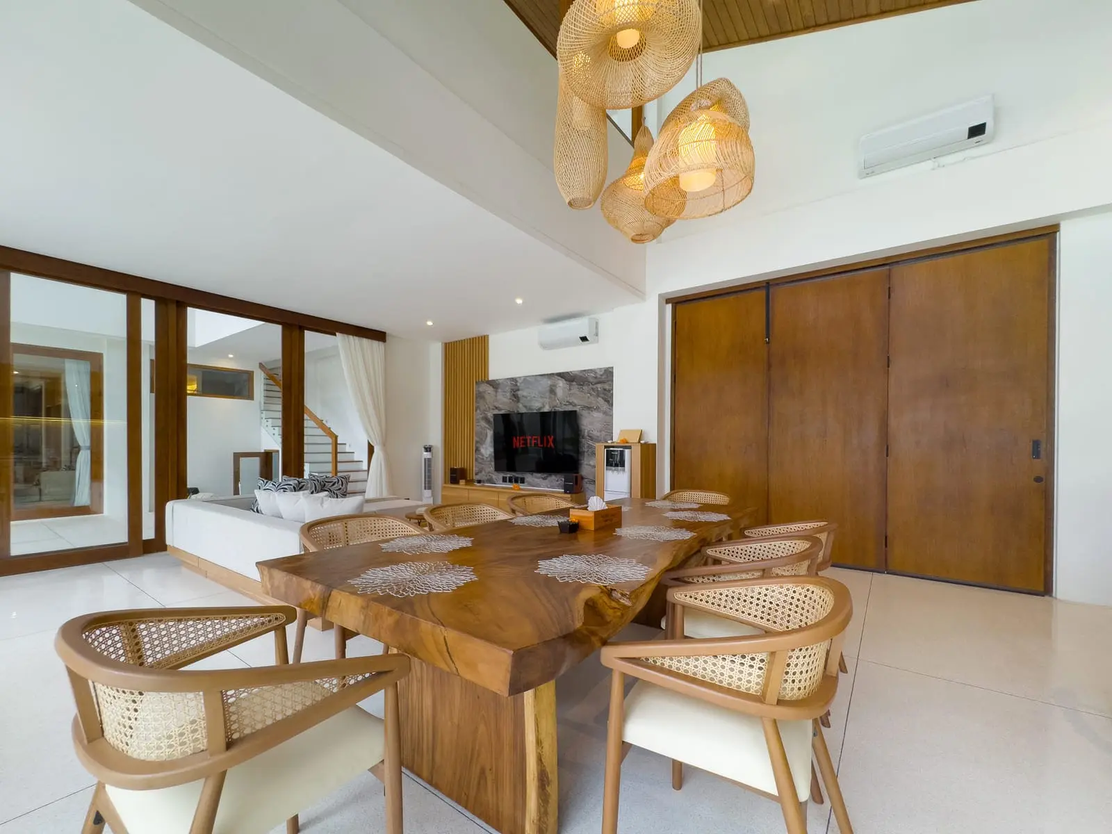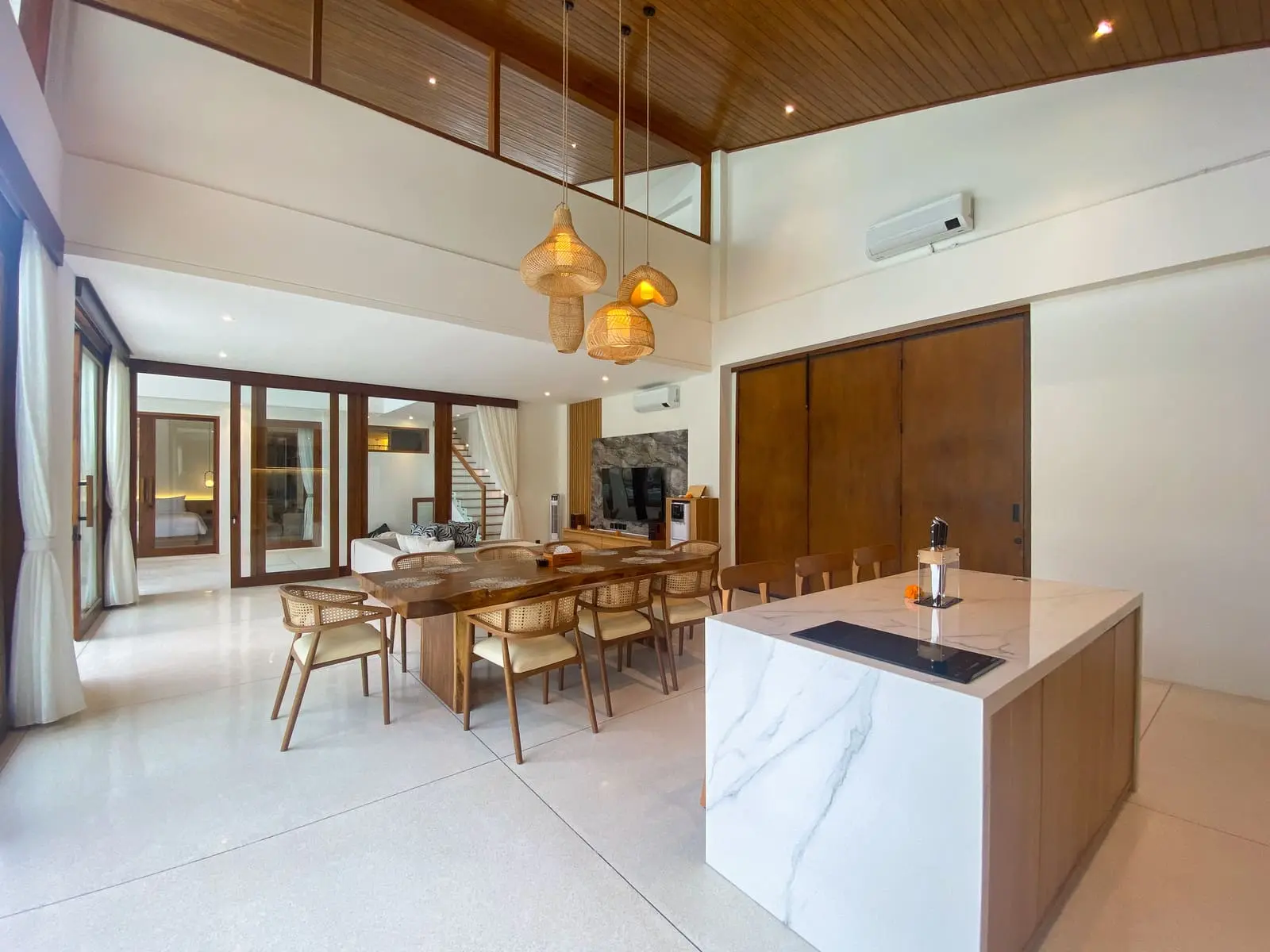 Each bedroom includes air-conditioning, an ensuite bathroom with a large bathtub, and stylish interiors inspired by Bali’s tropical essence. A fully equipped kitchen and thoughtful amenities—from bathrobes to mosquito repellents—ensure every detail of comfort is met.