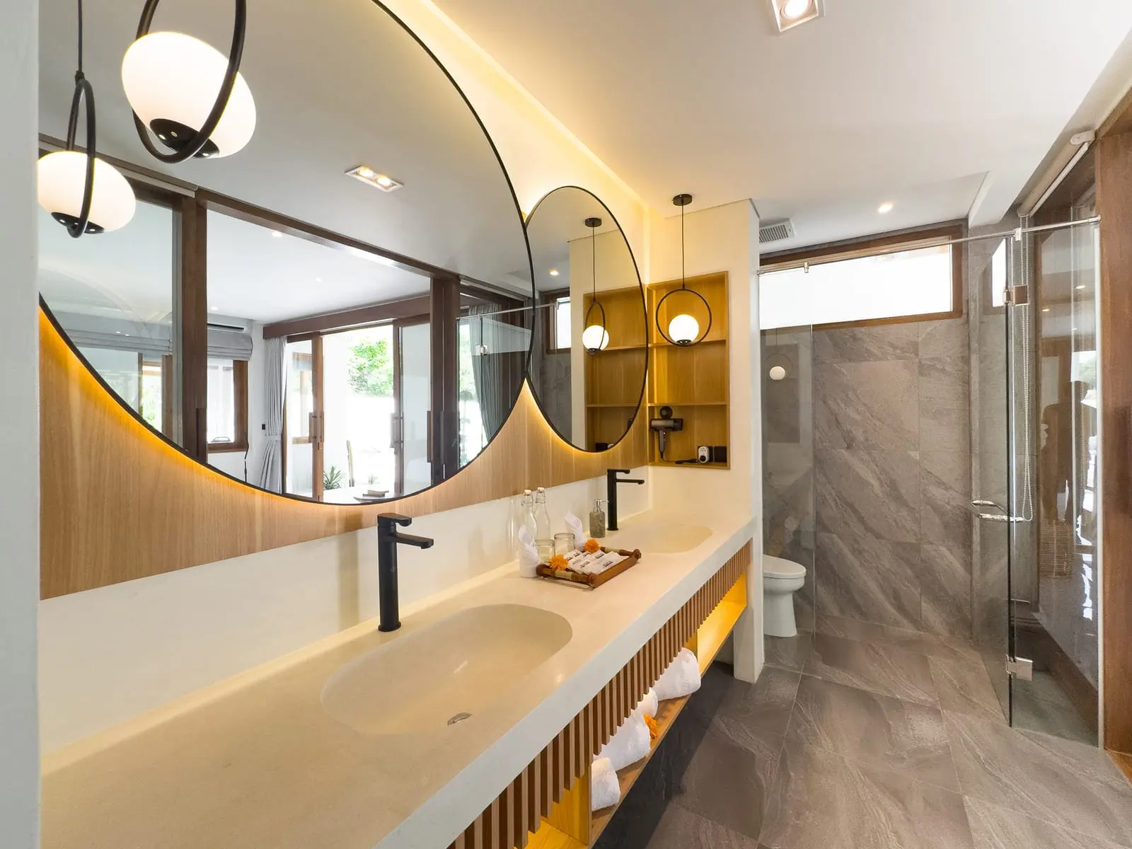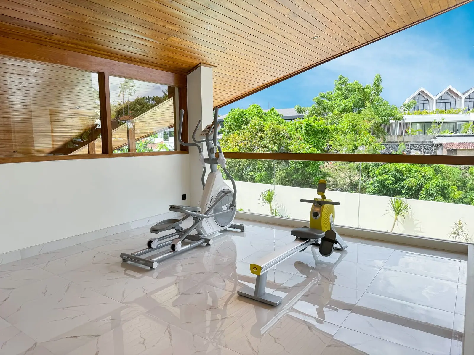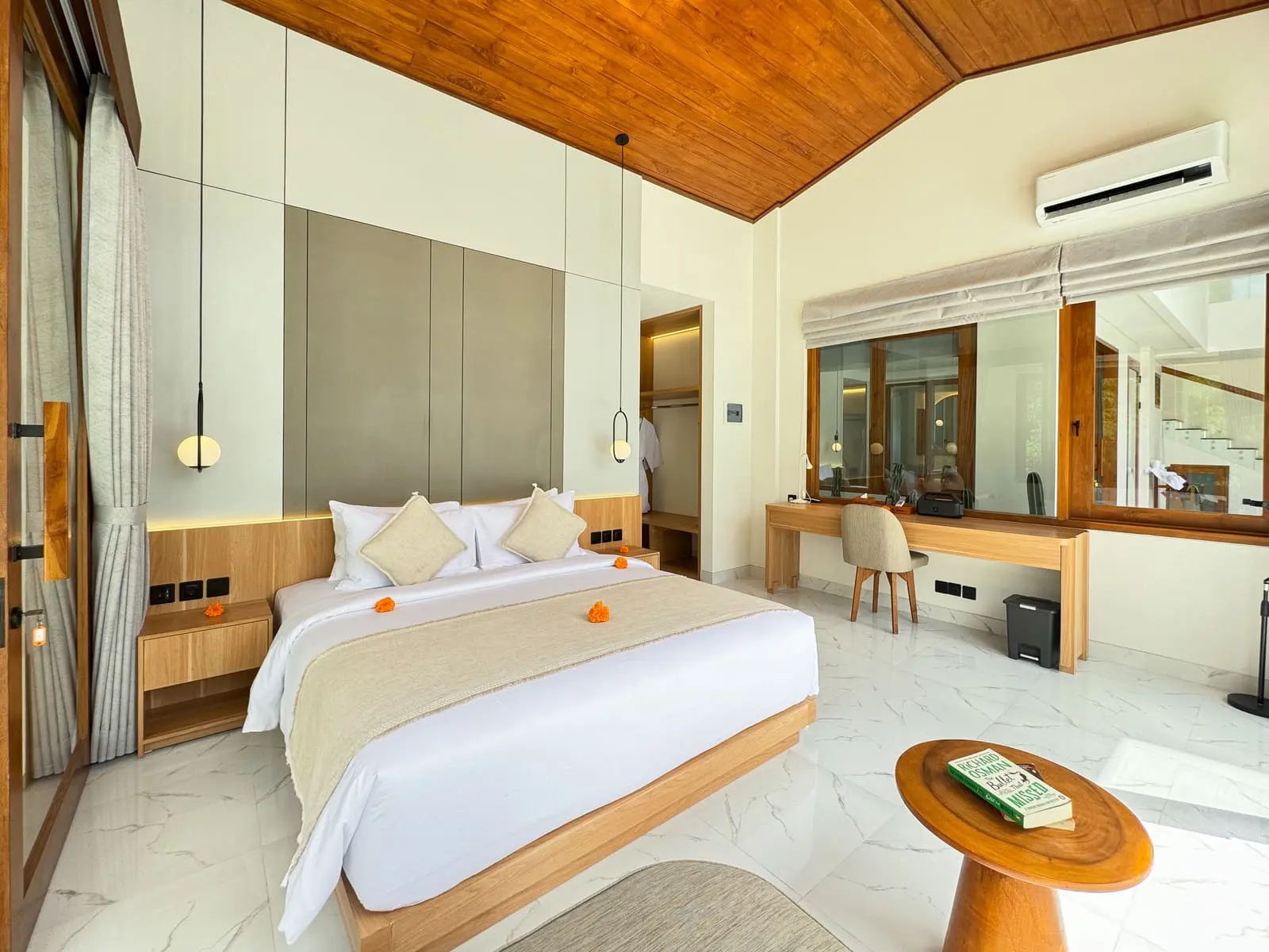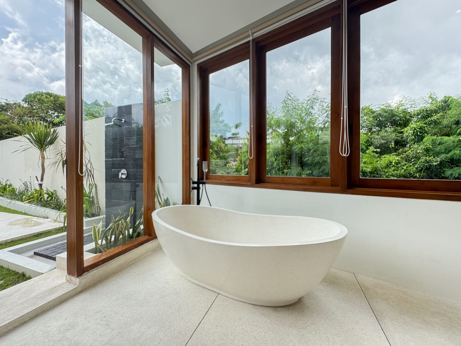 Each bedroom includes air-conditioning, an ensuite bathroom with a large bathtub, and stylish interiors inspired by Bali’s tropical essence. A fully equipped kitchen and thoughtful amenities—from bathrobes to mosquito repellents—ensure every detail of comfort is met.