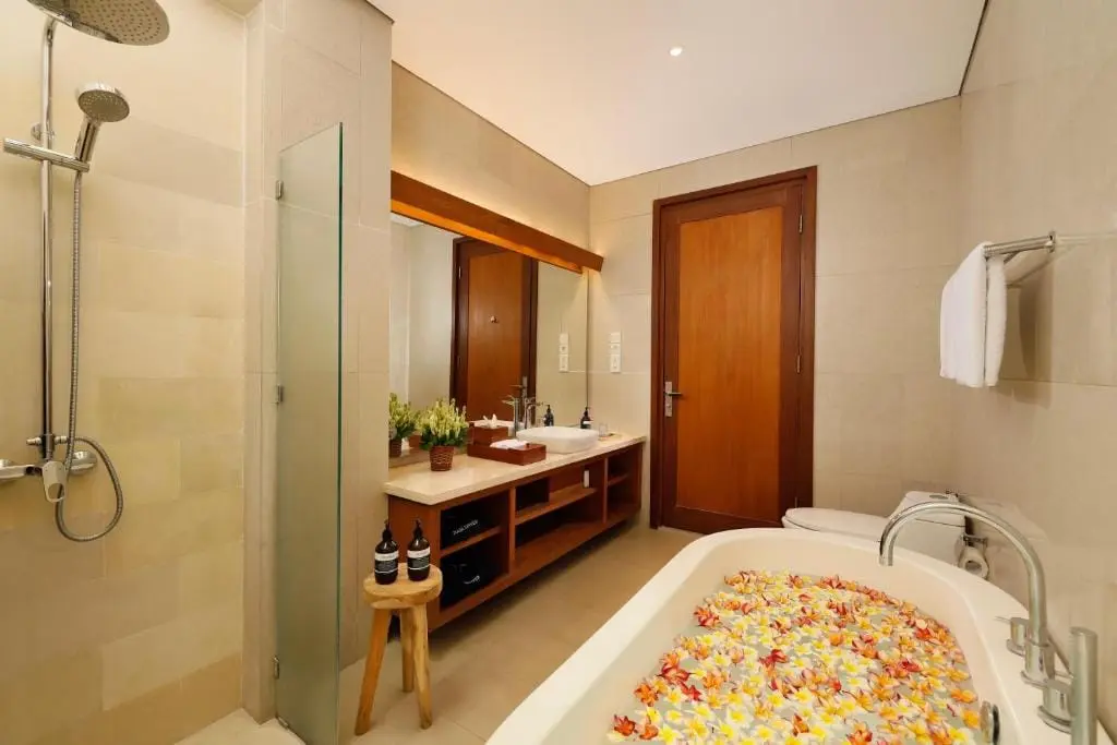 Discover the sophistication of Bija’s 3-bedroom villa, featuring “The Cherry Room.” This room boasts a stylish patio with a comfortable seating area and a sleek small kitchenette – an ideal setting for unwinding and socializing. The Cherry Room exudes an understated contemporary design. Moving to the right side, discover a wardrobe, an indoor bathtub, and a well-appointed bathroom.