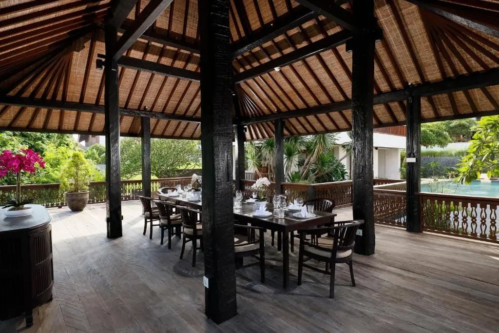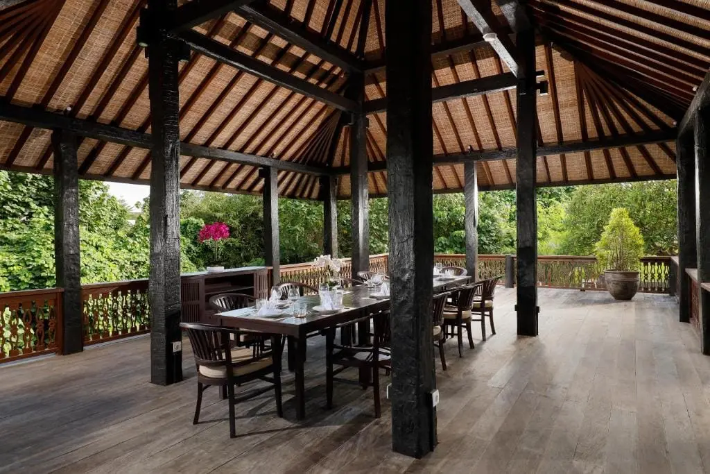 Explore the meticulously landscaped greenery surrounding the 6-bedroom villa, enhancing the serene ambiance around the inviting swimming pool and joglo area. Ascend a charming staircase to reach the joglo, a distinctive space designed for relaxation and entertainment. With seating for ten, the joglo offers an ideal vantage point for soaking in panoramic views of the meandering river and lush green surroundings.