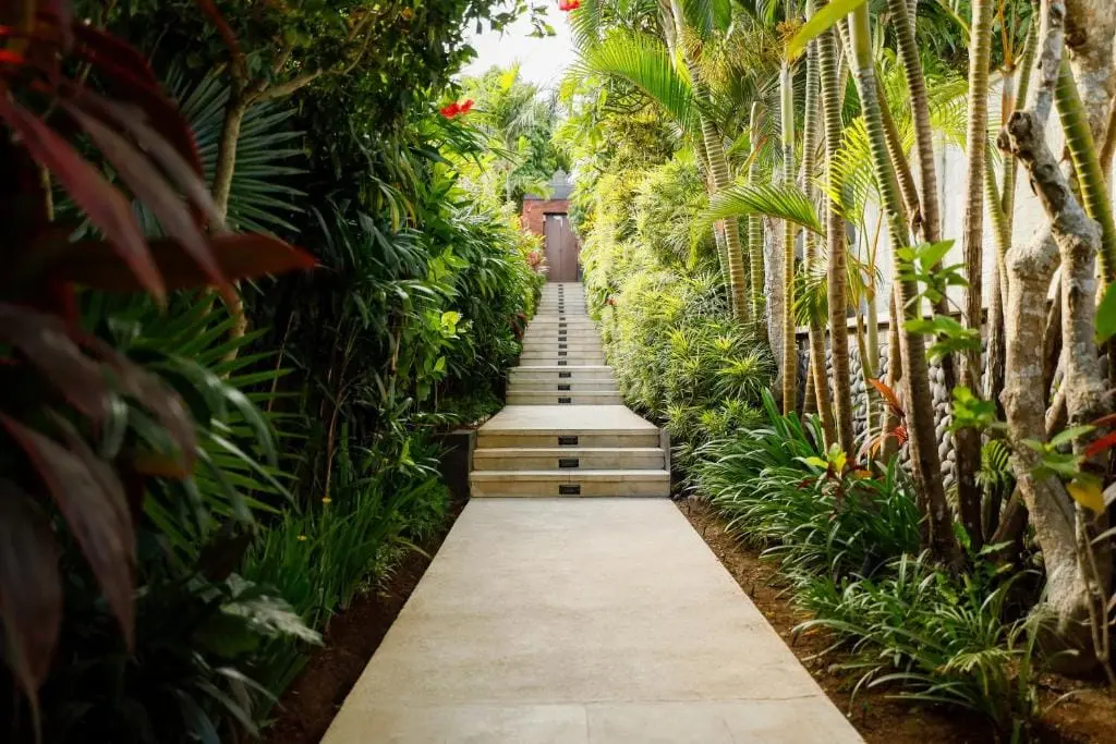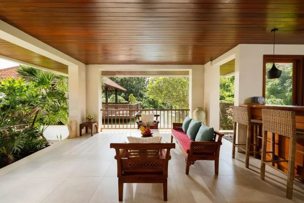 Step into the serene complex of our 3-bedroom villa, where well-manicured plants and a koi pond guide you towards the inviting entrance. Admire the craftsmanship of the entrance door, beautifully carved from wood and complemented by walls of warm red brick.