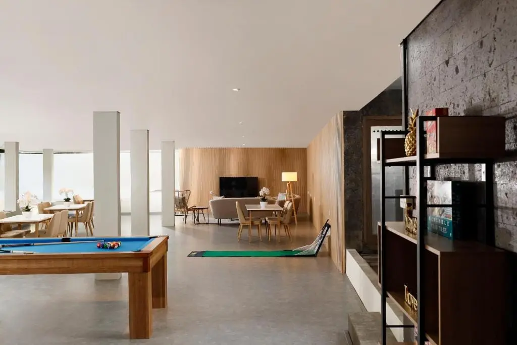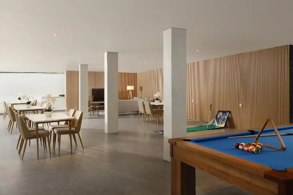 Beneath the joglo’s charm, a world of leisure awaits. Guests can enjoy a spirited game of pool or unwind in the semi-theater room, complete with a generous 65-inch TV for immersive entertainment. The main kitchen area beckons with its modern amenities, and a dining space is thoughtfully integrated, offering a perfect setting for shared meals and memorable conversations.