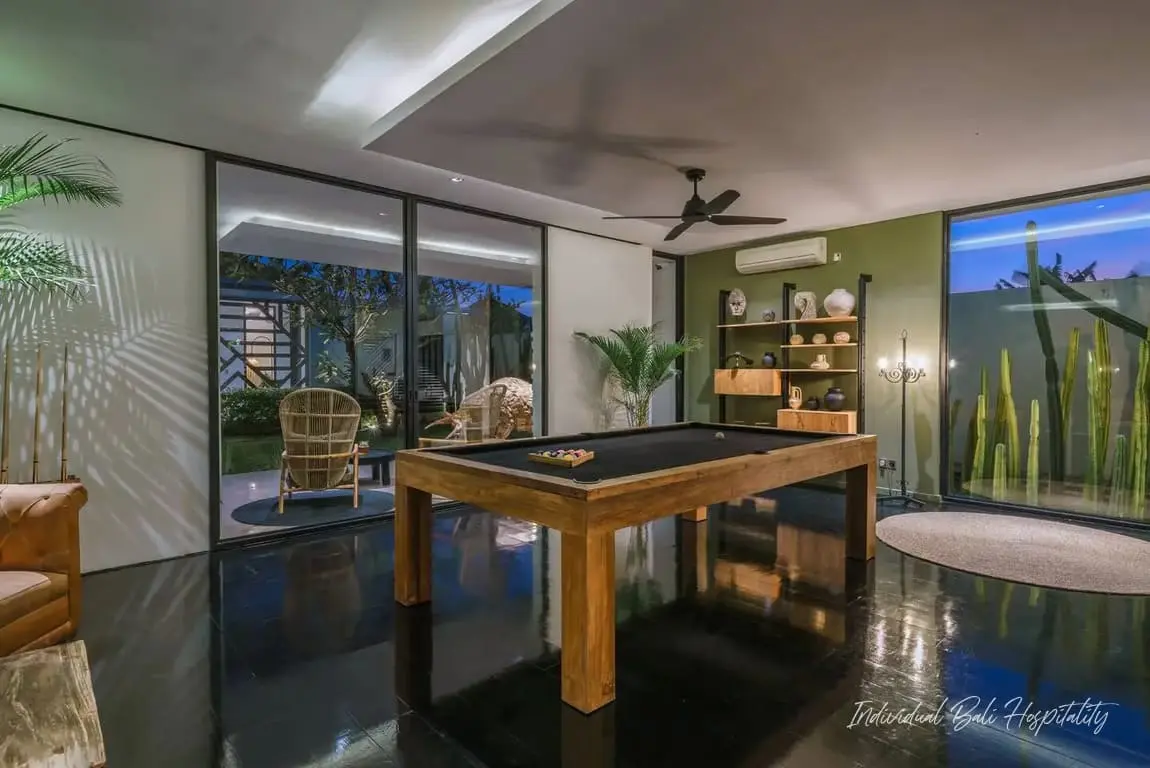 The interiors of The Bull House combine tropical-inspired artifacts with modern luxury amenities. The open-plan living room features a massive sofa for up to 20 guests, a billiard table, and bay windows that let in natural light. A fully equipped modern kitchen and a dining area for 12 guests make it ideal for both casual meals and private chef dining experiences.