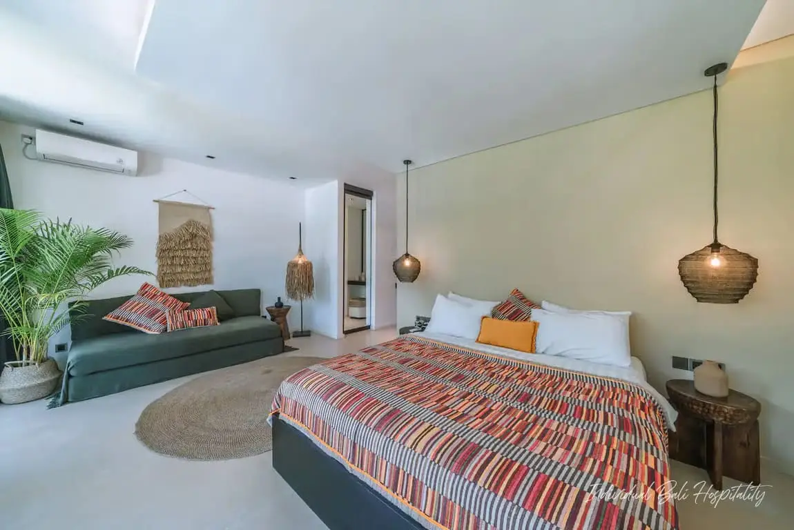 Each bedroom is a sanctuary of comfort, complete with a king-sized bed, en-suite bathroom with bathtub, air conditioning, and boho-chic décor. Upstairs, guests will find a media room and two rooftop terraces, perfect for sunset views or evening cocktails.