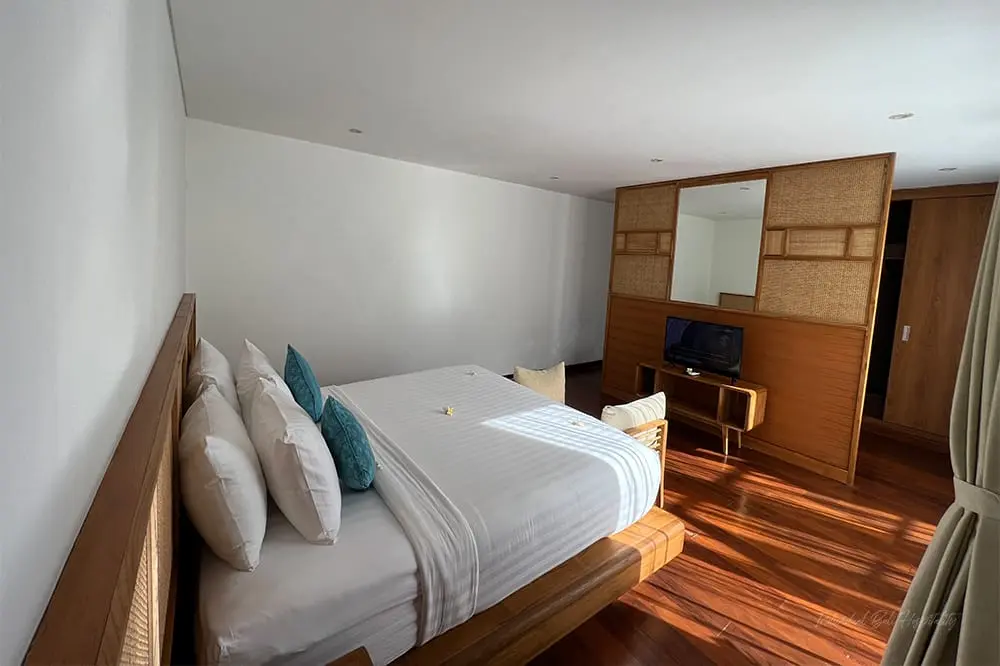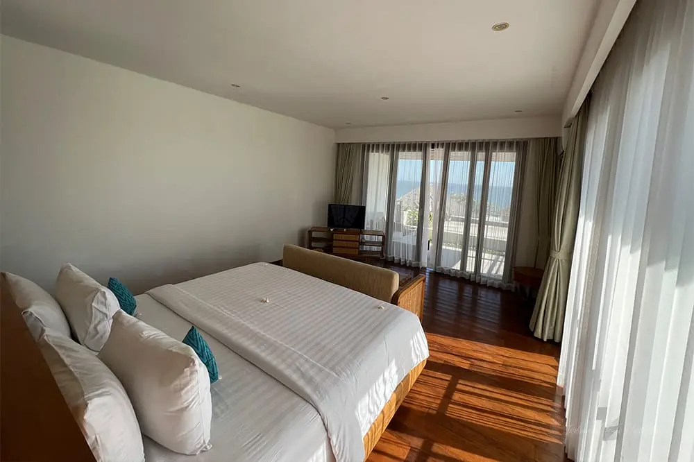 The master suite boasts a plush king-sized bed, TV, en-suite bathroom, and private balcony with sea views. The two guest bedrooms on the first floor also feature plush beds, TVs, and en-suite bathrooms. All bathrooms include grand stone bathtubs for a relaxing soak after a day of adventures.