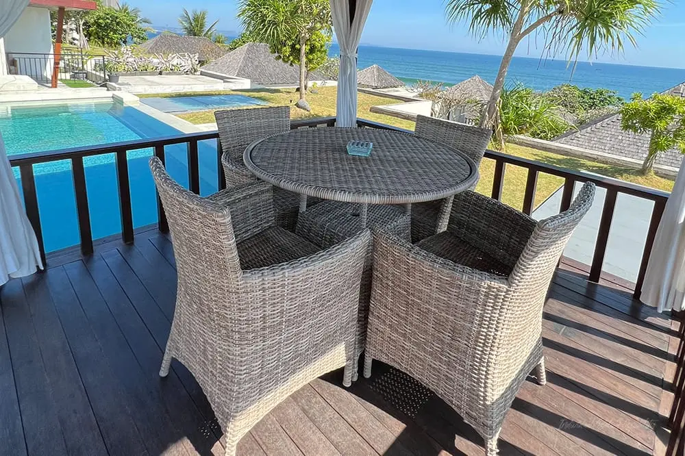 The villa features an open-air dining table on the first floor, perfect for family meals and gatherings. The main terrace on the second floor boasts an infinity swimming pool, poolside bale, and sunbeds, offering breathtaking views of the sea. Spend your days soaking up the sun, watching the waves, and dining in the poolside bale for a sunset meal. The well-kept gardens and wooden decking provide ample space for children to play.