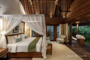 Inside, the villa features open-air pavilions that seamlessly blend indoor luxury with Bali’s natural surroundings. Rich teakwood interiors, soaring vaulted ceilings, and hand-carved accents reflect timeless Balinese craftsmanship, while curated contemporary artworks and handcrafted treasures from across Indonesia celebrate the archipelago’s rich cultural heritage.