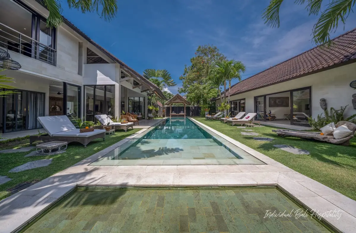 Villa Abaca is a stunning compound villa located in the heart of Seminyak, offering a total of 16 bedrooms across three private villas. The villas consist of one six-bedroom villa and two five-bedroom villas, each boasting its own private living areas and swimming pools, complete with a shallow section perfect for young travelers.