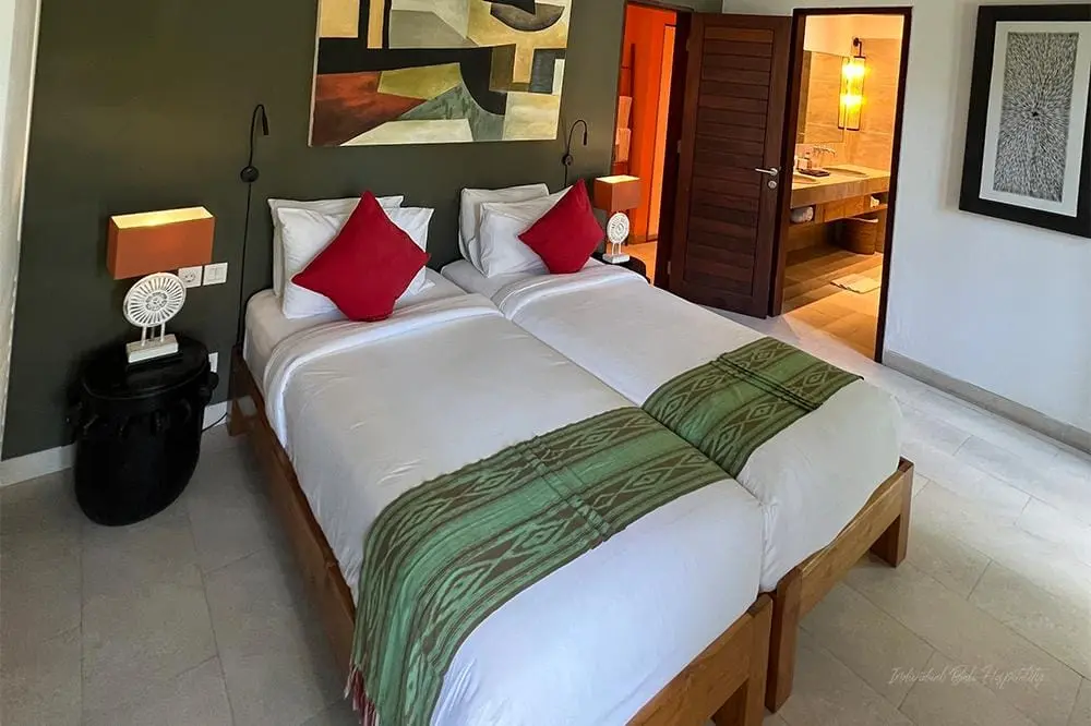 The guest bedrooms are situated in separate pavilions, with three bedrooms on the ground floor and two on the first floor. Each bedroom is equipped with a queen-sized bed or two single beds, ensuite bathroom, ceiling fan, air conditioning, cabled TV, DVD player, and a mini-bar and safe.