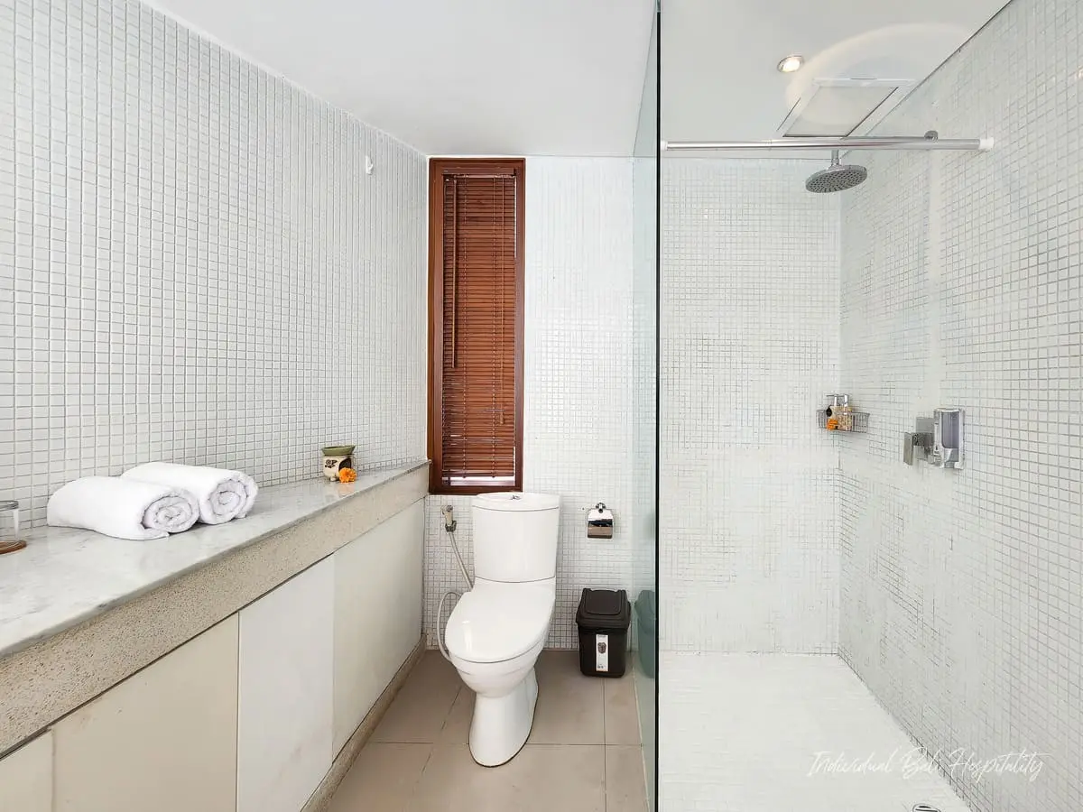All three bedrooms are situated on the second floor, each thoughtfully designed for privacy and comfort. King size beds with premium mattresses promise restful nights. The master suite boasts a generous dressing area and a luxurious ensuite bathroom complete with a bathtub, separate shower, dual sinks, and a large mirror, a perfect place to relax after a day in the sun.