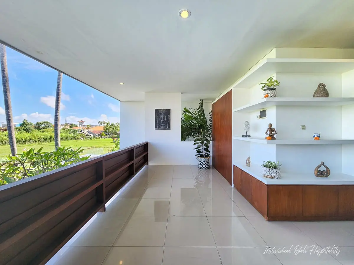 Upstairs, a spacious wooden balcony reveals beautiful views of the surrounding rice fields, an ideal spot for your morning coffee or a sunset drink.