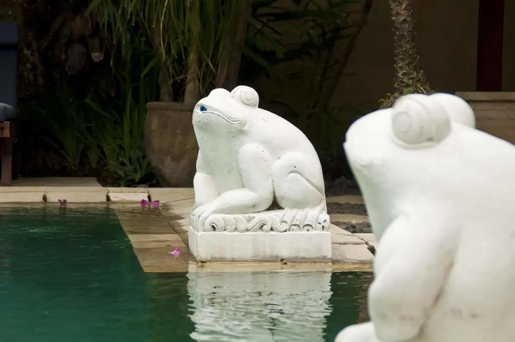 The grounds of Villa Arjuna feature an enticing swimming pool surrounded by tropical gardens. A gazebo with comfortable seating invites guests to relax in the shade. Additionally, a calm fishpond located between the two guesthouses adds to the tranquil ambiance with a soothing water feature.