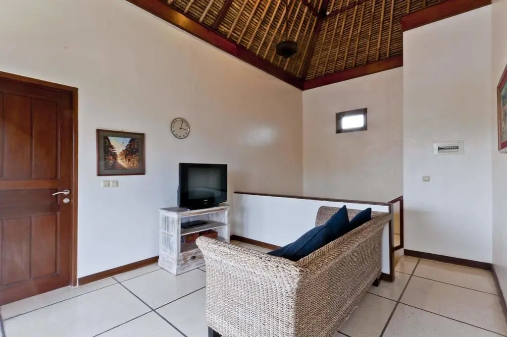 The main building of Villa Arjuna houses the living area, dining space, and a kitchen downstairs, as well as a bedroom, TV room, and office upstairs. The spacious living area features two sofas and a big screen television. The dining area has a round marble-topped table and six chairs, perfect for socializing and group dining. The fully equipped kitchen includes a large refrigerator, stove, oven, microwave, water dispenser, coffee maker, blender, and ample pots, pans, utensils, cutlery, glasses, and chinaware.