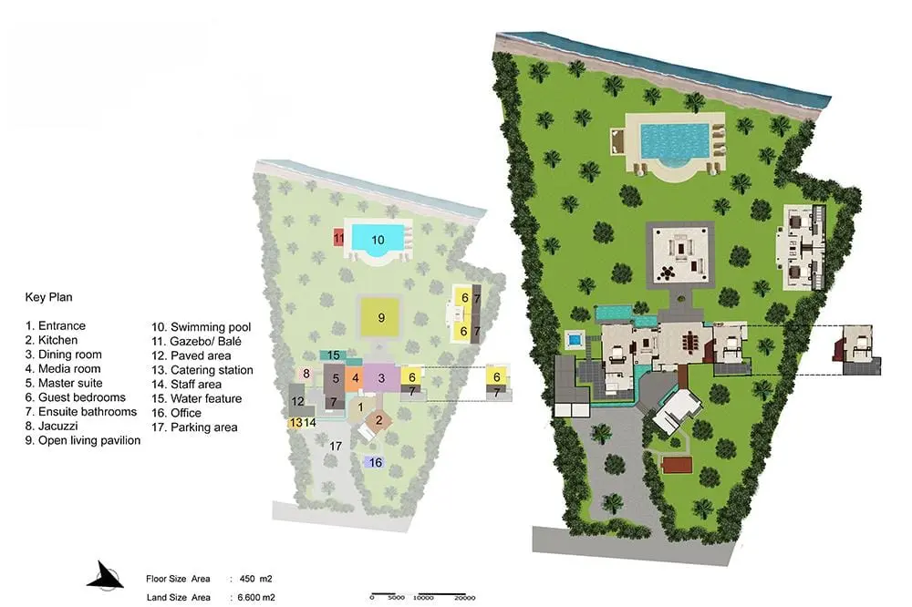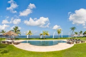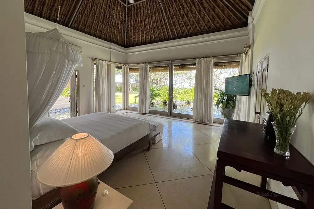 The estate features five sumptuous bedrooms and stands unrivaled as a luxury destination villa, offering over 100 meters of direct beach access. Its 14-meter swimming pool is a stone’s throw from the sandy beach, ensuring that guests can easily transition between the comfort of their villa and the natural beauty of the oceanfront. The main villa building, interconnected with enchanting lotus ponds, hosts an array of essential facilities including the dining room, media room, two guest bedrooms, and a master suite complete with a private garden plunge pool. The privacy and elegance extend to the two “Ocean” bedrooms located in a separate pavilion by the beach, each room offering majestic views and elegant furnishings oriented towards the ocean.