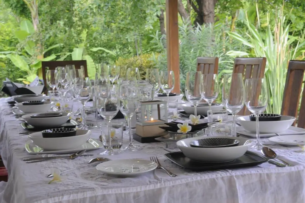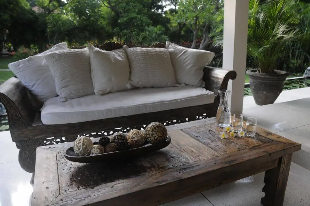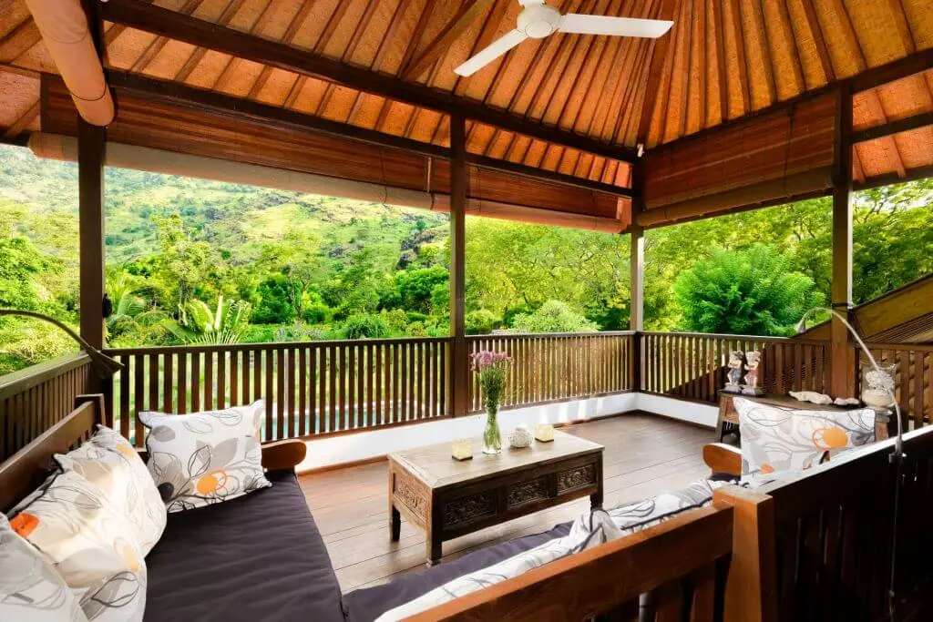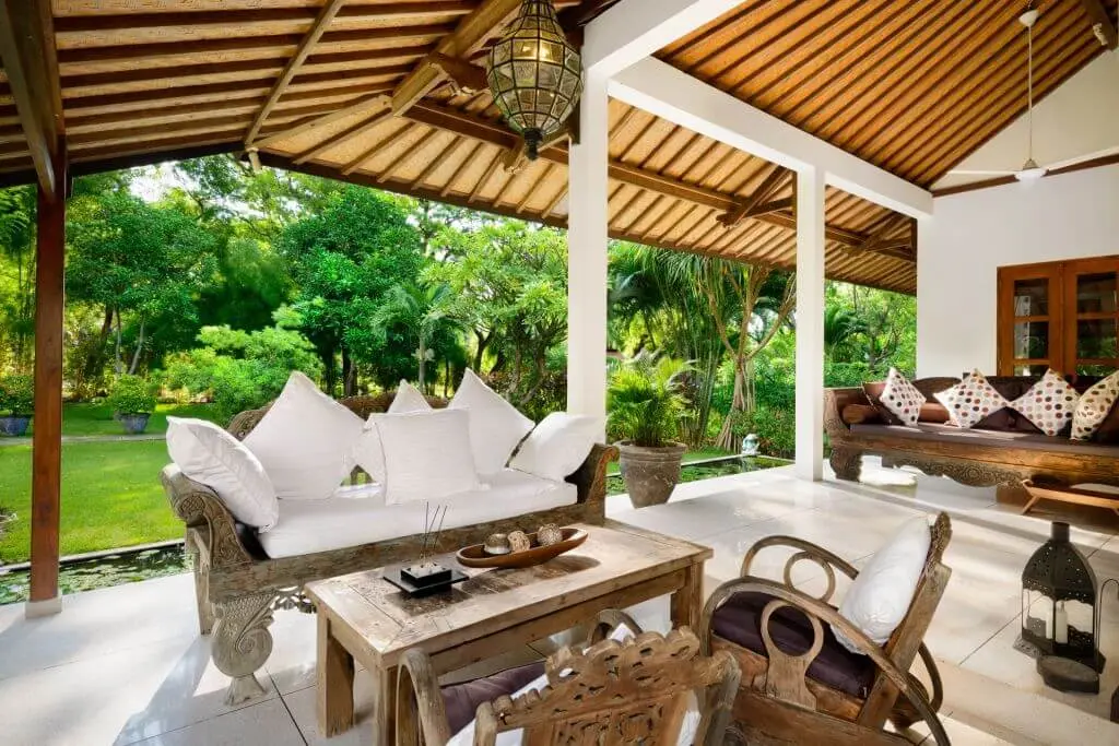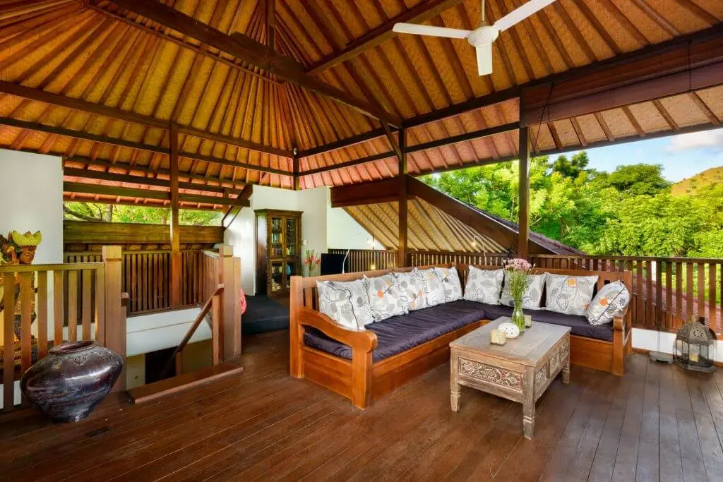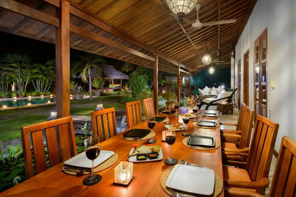 In the front and sides of this luxury villa is a large veranda. The veranda has several beautiful sitting areas that provide a gorgeous view of the majestic mountains and beautiful tropical gardens. The dining area has a large teak-wood dining table (3.5 m), which seats up to ten guests. The light terrazzo floors give the environment a fresh, airy and spacious character. On the terrace are also ceiling fans if cooling is required.