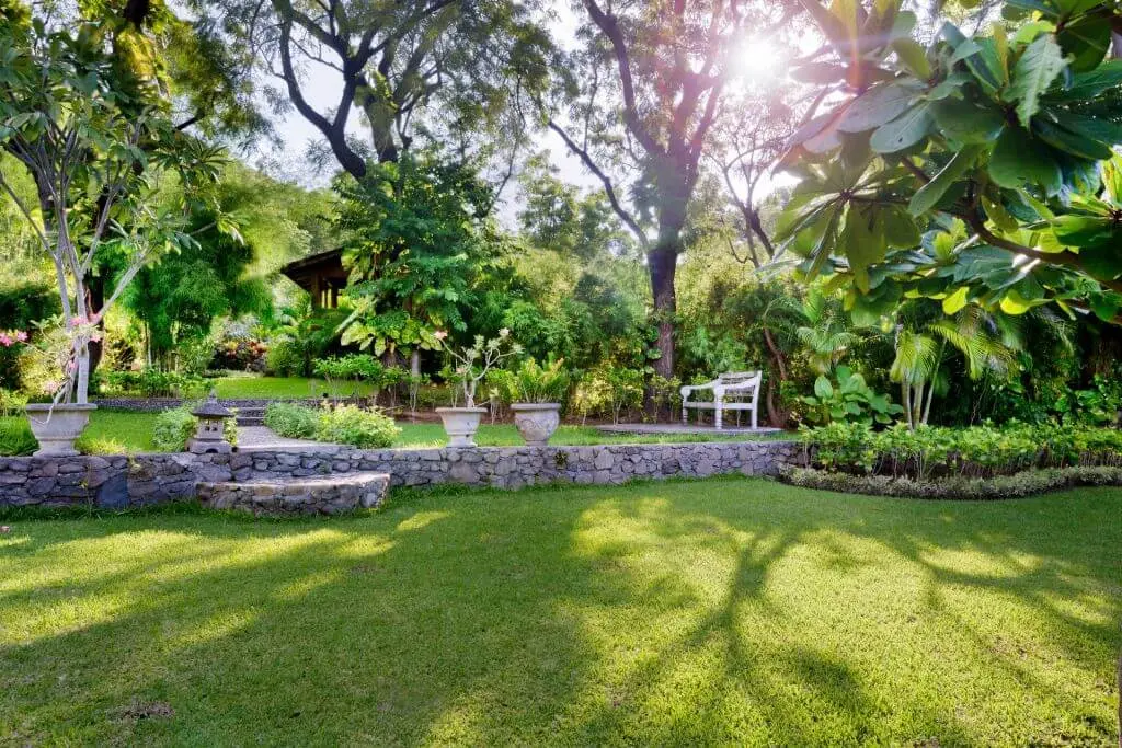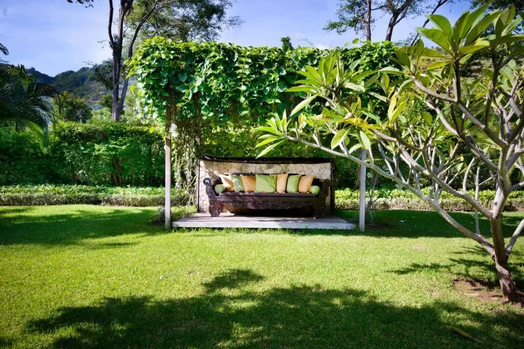 The (saltwater) private pool (5x12m) in the garden is situated in front of the villa and is free of chlorine. On the wooden terrace are deckchairs, towels and umbrellas. The pool is beautifully illuminated at night. Beside the pool is a Balinese gazebo for relaxing and enjoying the garden and spectacular views. The spacious, open 3500 m² tropical garden consists of a sloping lawn with many different species of trees, palms, plants and flowers. Around the pool are planted Singapore-, Palm- and Frangipane trees.