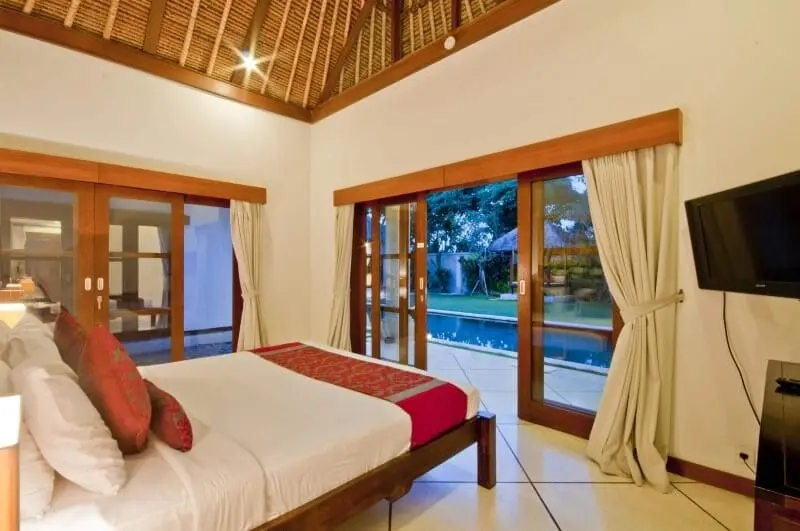 Villa Darma comprises five minimalist-style bedrooms, each with a king-sized bed, wardrobe, television, ceiling fan, and air conditioning unit. Three bedrooms are housed in detached guesthouses around the pool, while the remaining two are semi-detached to the main building. An additional sofa bed in one of the rooms provides sleeping space for two extra guests if needed. All bedrooms feature partially open en-suite bathrooms for a tranquil showering experience.
