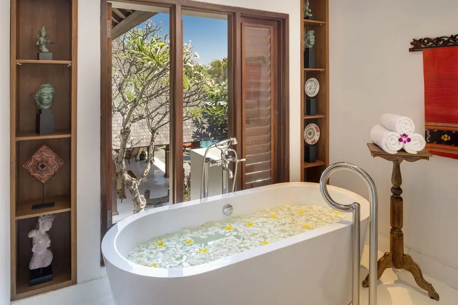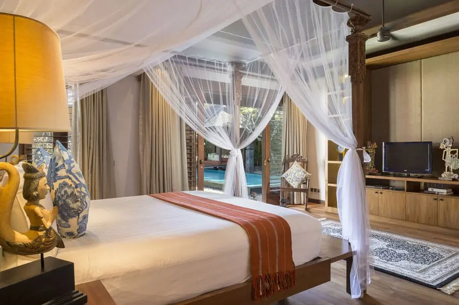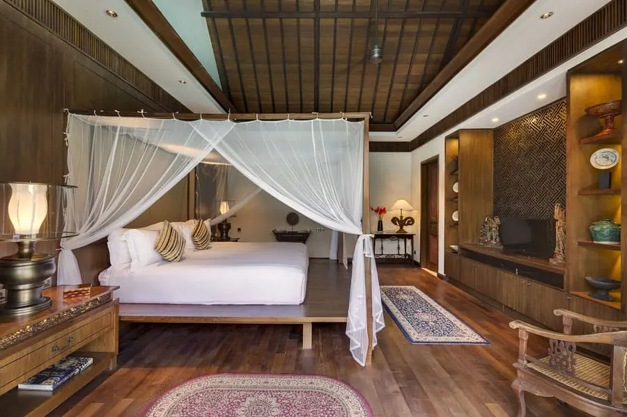 The villas’s five bedrooms are spacious and handsomely designed, with teakwood-lined vaulted ceilings, custom-designed display cabinets, and polished wood floors embellished with oriental rugs. Four feature a king-size four-poster beds swathed in mosquito netting, while twin beds (that convert to a king if preferred) rest under a towering mosquito net in the fifth bedroom.