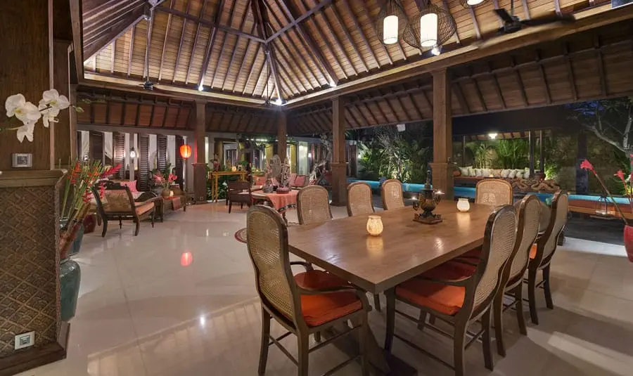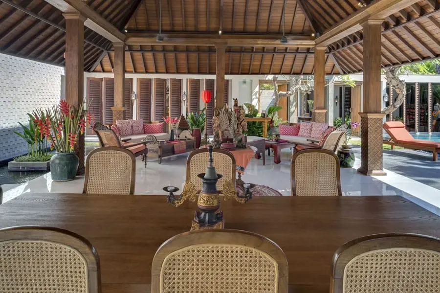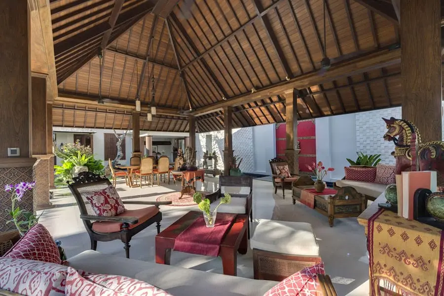 A second fan-cooled living area, richly decorated with antique Indonesian furniture, faces the villa’s smaller swimming pool.