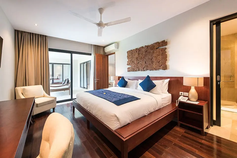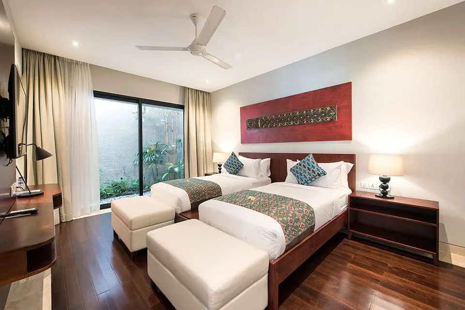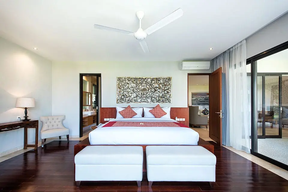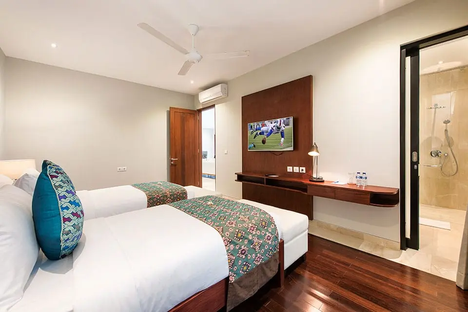Accommodations include four exquisite bedrooms for eight guests. The master room on the top floor boasts a stunning ocean view, a king-sized bed with high thread count linen, and batik accents for refined style. The ensuite bathroom, adorned with white marble, features a bath, double vanity, walk-in wardrobe, and a delightful rainfall shower. Rooms two and three, located downstairs, are garden-facing double rooms with king beds, tastefully decorated with subtle pops of batik and woodwork. Each room includes its own television and ensuite. Bedroom four, tucked away at the back, offers twin beds (convertible to a king bed) with redwood paneling, providing a quiet retreat for kids or single guests.