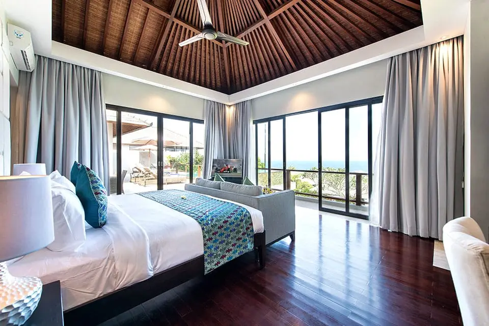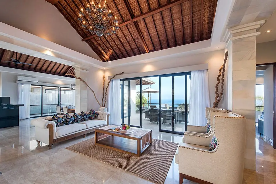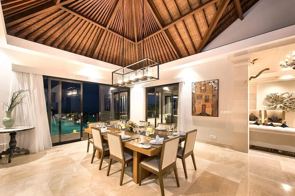 Villa Dewi Lanjar, a 4-bedroom retreat, is perched atop the limestone cliffs of Bukit Peninsula, offering a serene and majestic experience. The villa features expansive marble floors and captivating decor, providing unparalleled views of the Indian Ocean. With luxurious bedrooms, opulent living spaces, a premium European kitchen, and an infinity pool overlooking Pandawa Beach, this property is designed for profound relaxation.