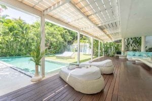 The ensuite bedrooms all have double-sized beds (with one room that can be split into twin beds), connected to an ensuite bathroom with rainshow and bathtub, and are complete with toiletries, towels and fresh linens. 4 of the 12 villa units at EDEN – The Residence at the Sea complex, can be connected through the use of sliding walls in the garden and become two 8-bedroom villas (Villa 5 & 6 and Villa 8 & 9).